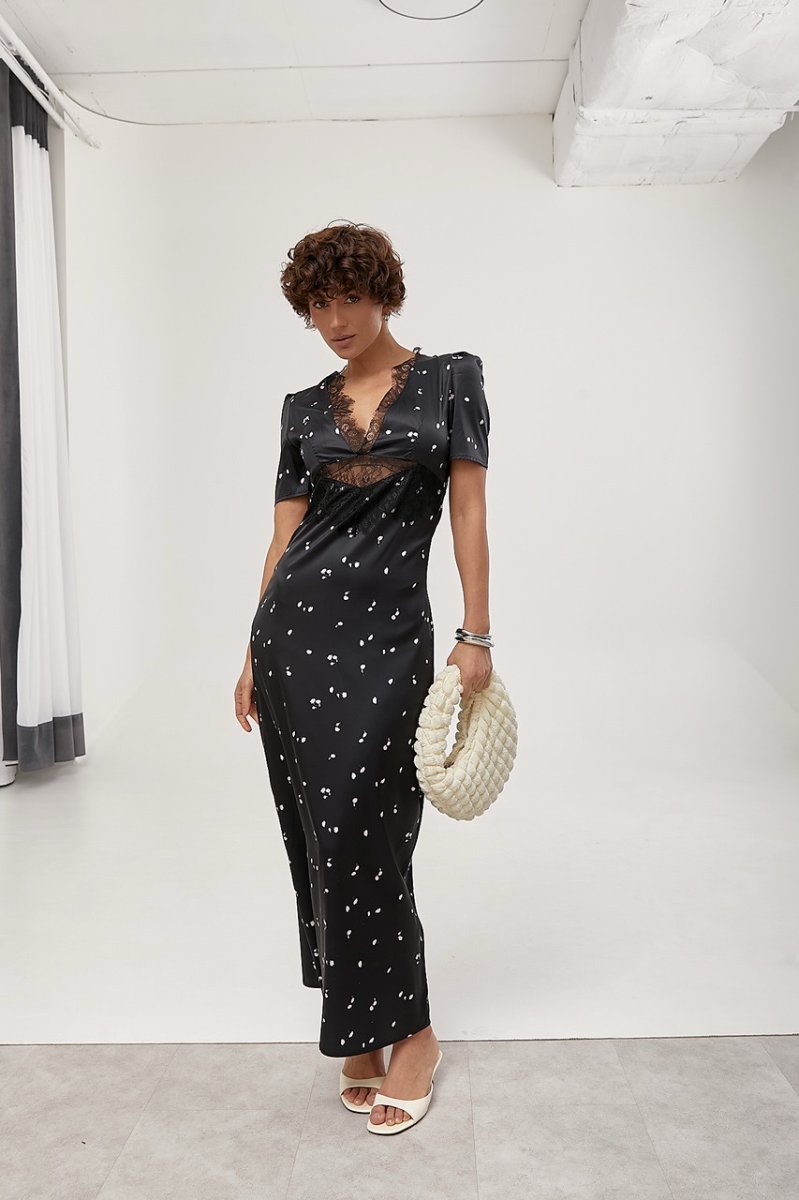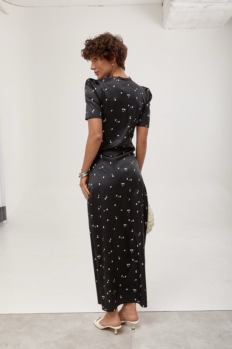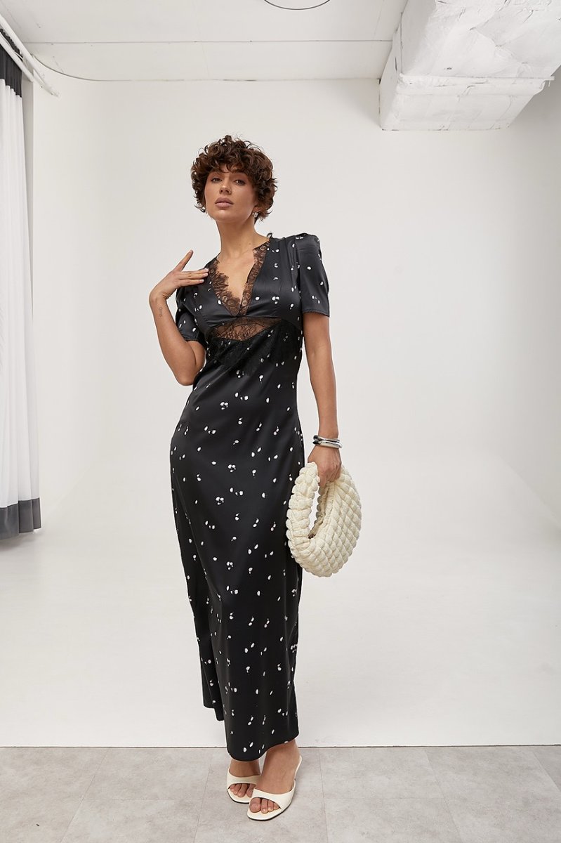 Елегантна довга атласна сукня з мереживом — вишуканий та жіночний образ. Відкрите декольте підкреслює груди, а короткі рукави-ліхтарики додають легкості та романтичності.