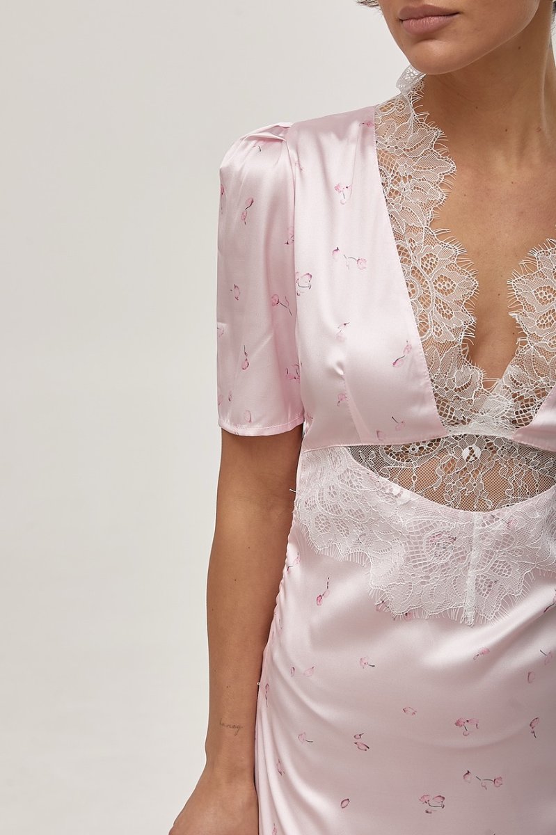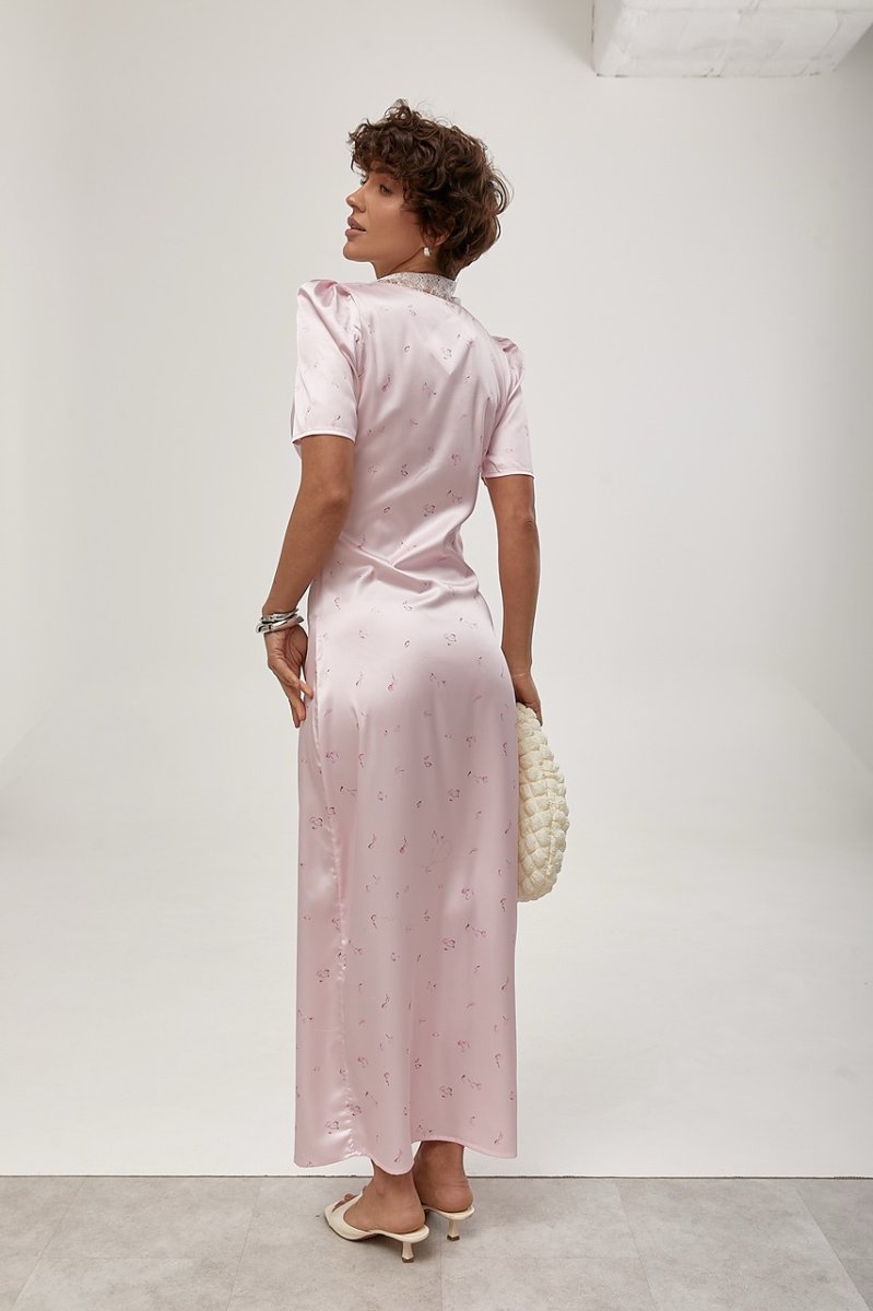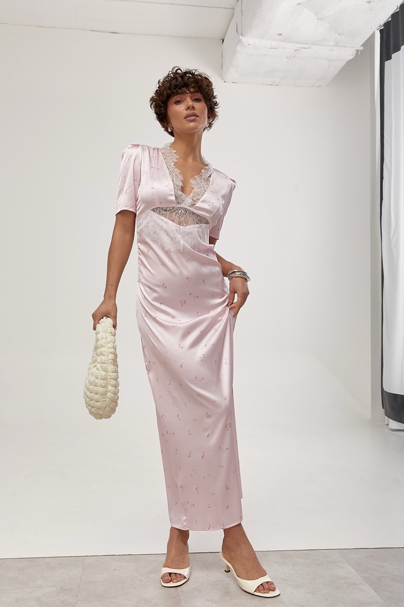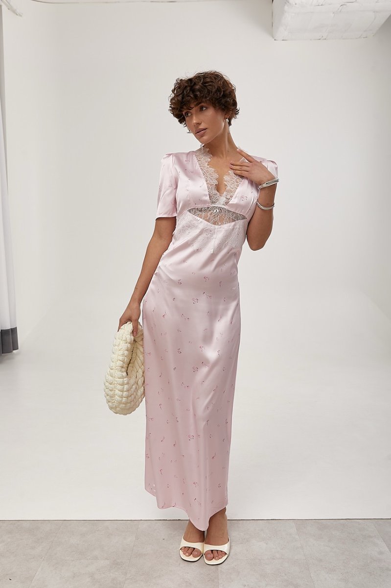 Елегантна довга атласна сукня з мереживом — вишуканий та жіночний образ. Відкрите декольте підкреслює груди, а короткі рукави-ліхтарики додають легкості та романтичності.