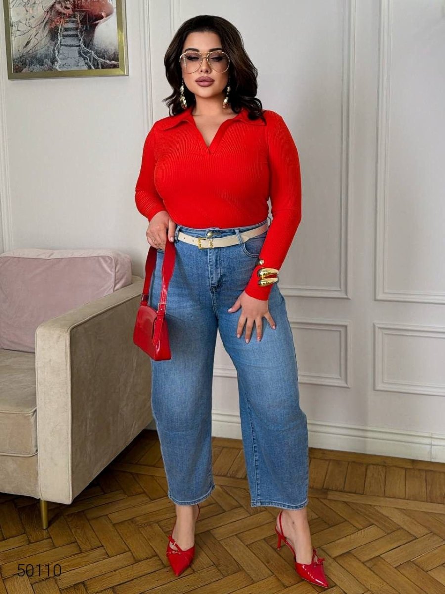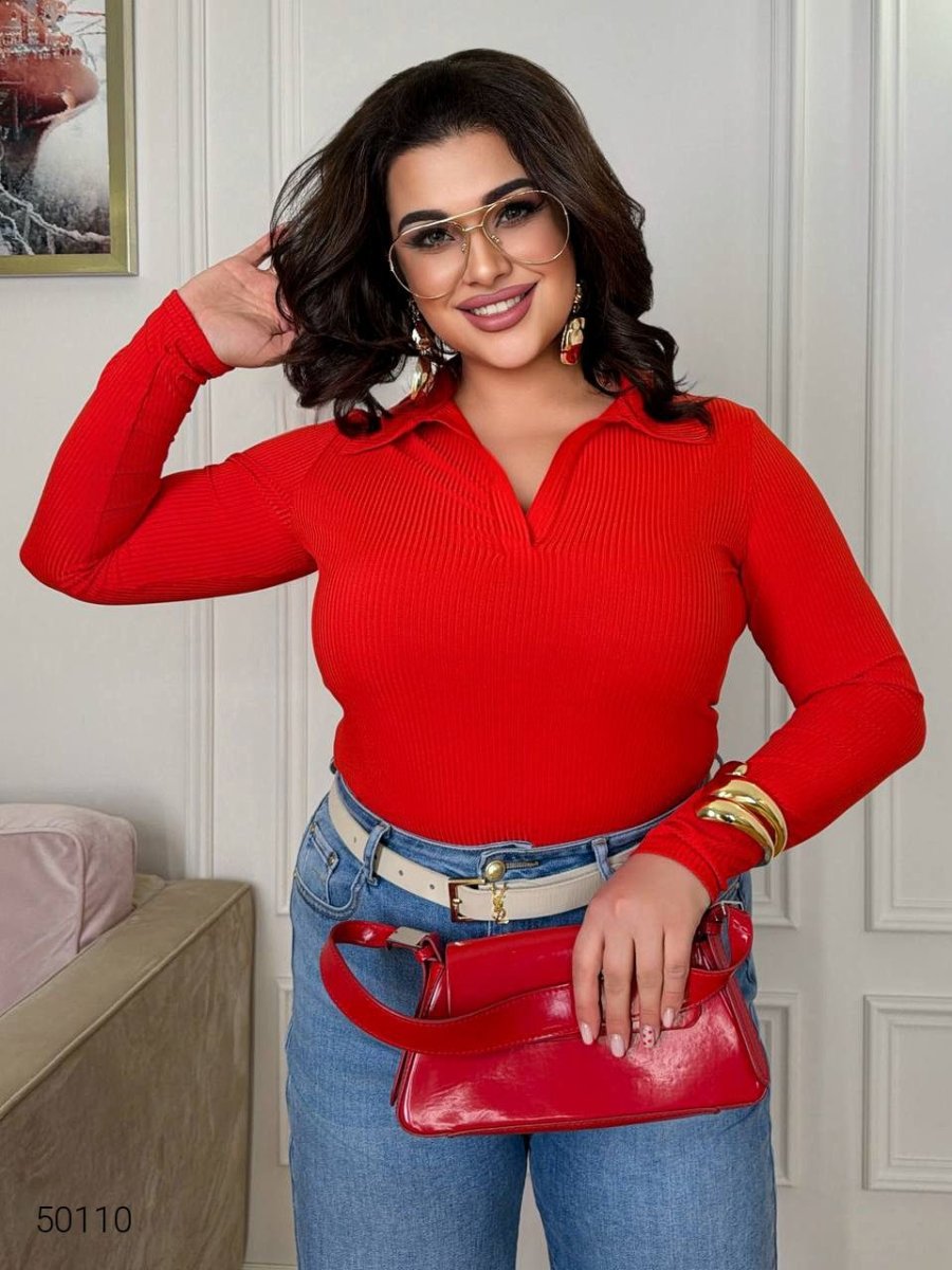 Жіночий джемпер-поло вільного фасону, виконаний із трикотажу в рубчик з еластичністю до +15 см. Модель універсальна, комфортна для повсякденного носіння, без застібки, прямий крій підкреслює природний силует.