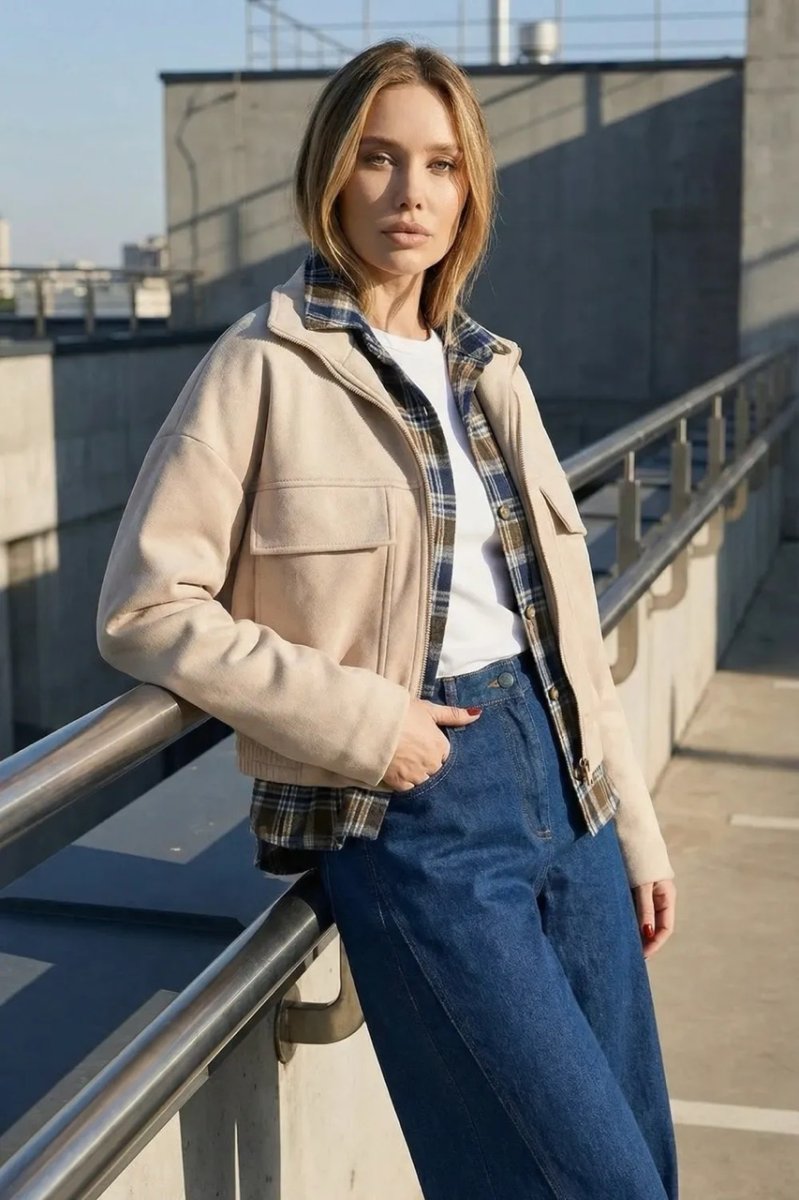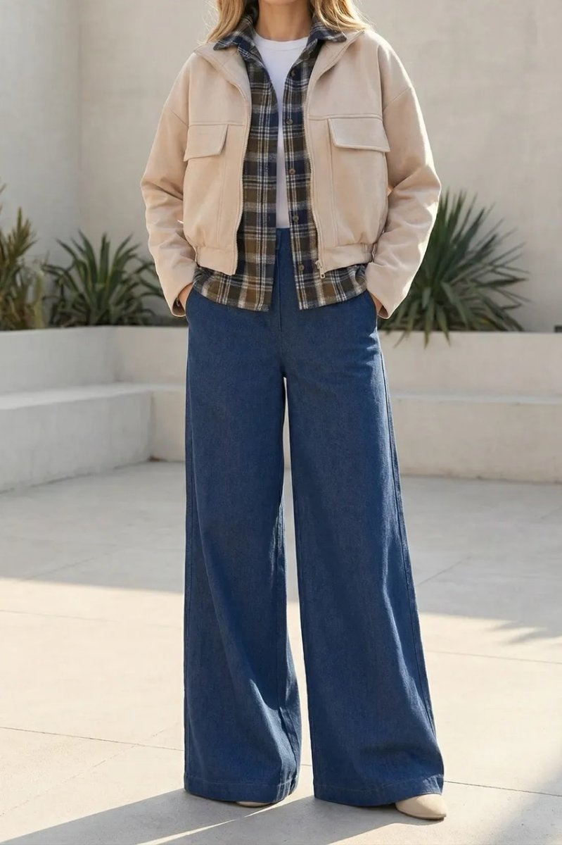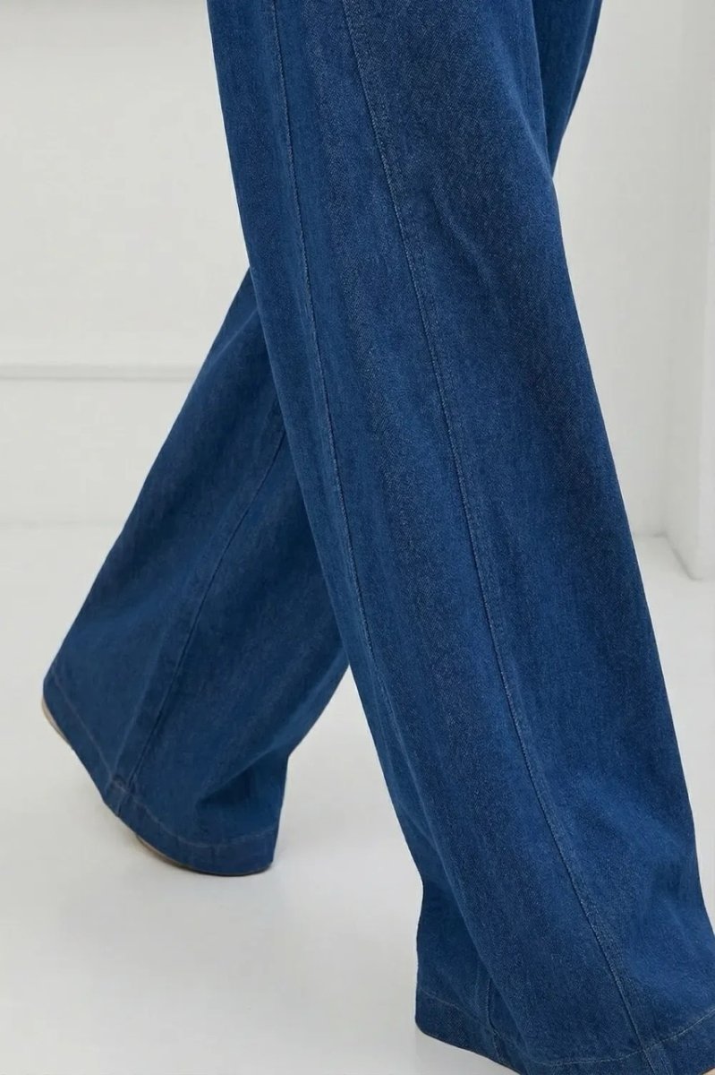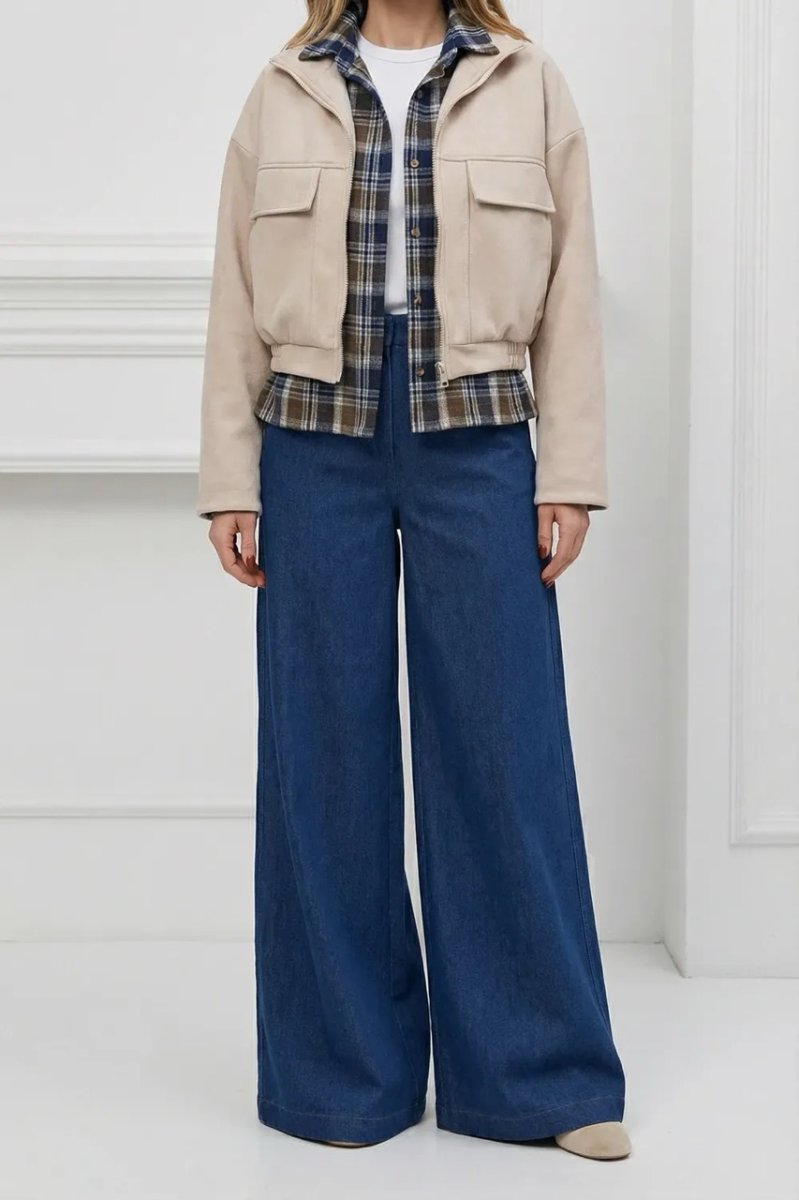Стильні демісезонні джинси синього кольору з прямим вільним кроєм та функціональними деталями.