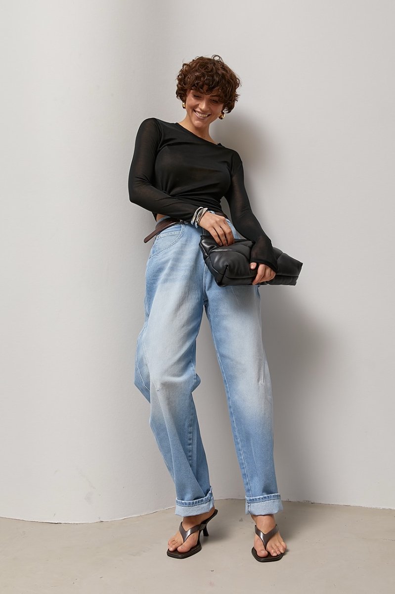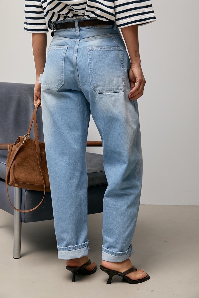 Особливим акцентом виступає декоративний шов на штанині, який додає моделі оригінальності та підкреслює її дизайнерський характер. Спереду розташовані врізні кишені, а ззаду — накладні кишені, які додають джинсам класичної завершеності та практичності.
