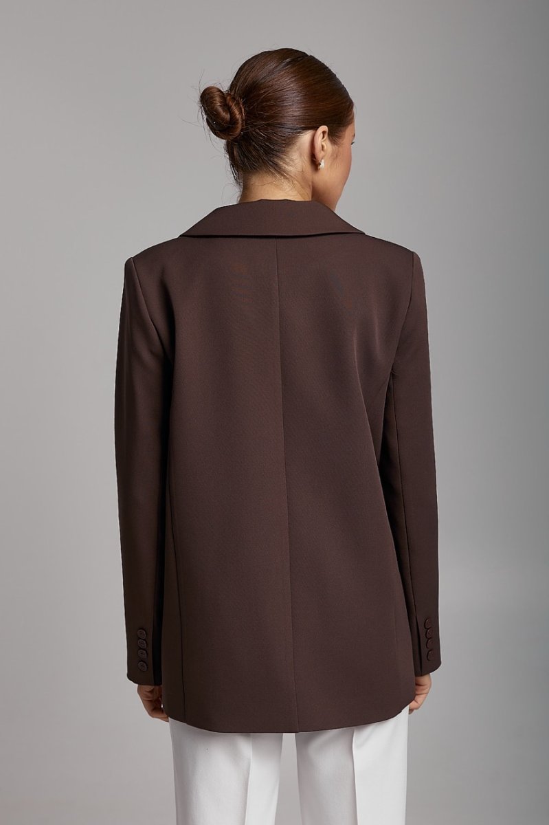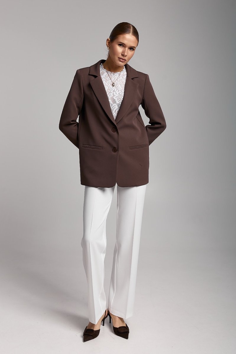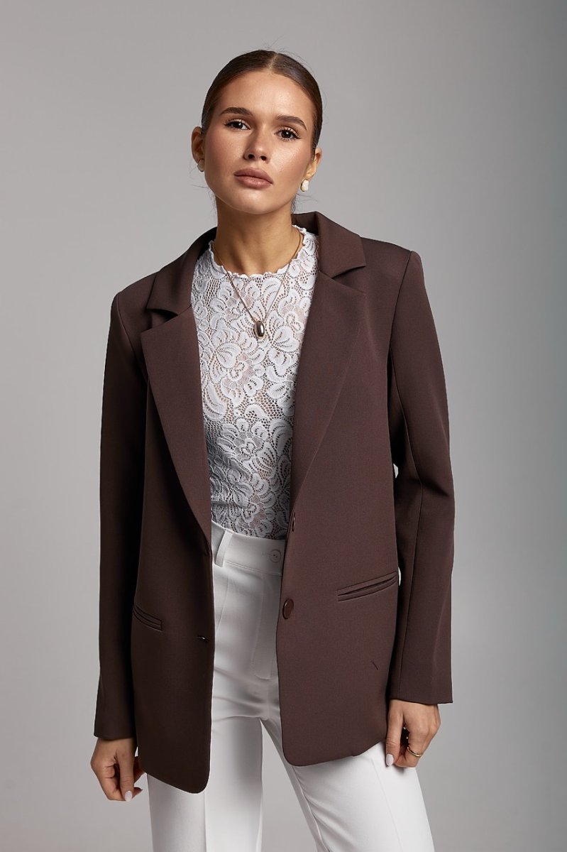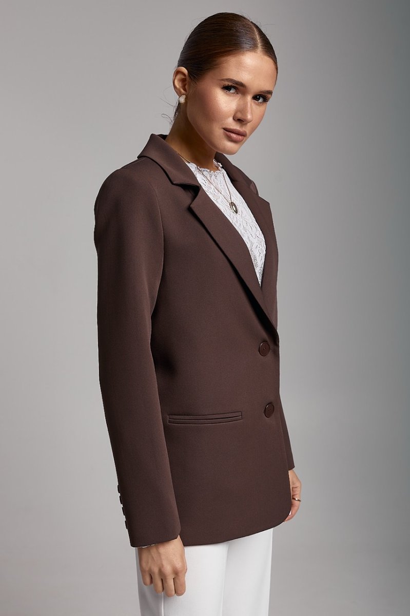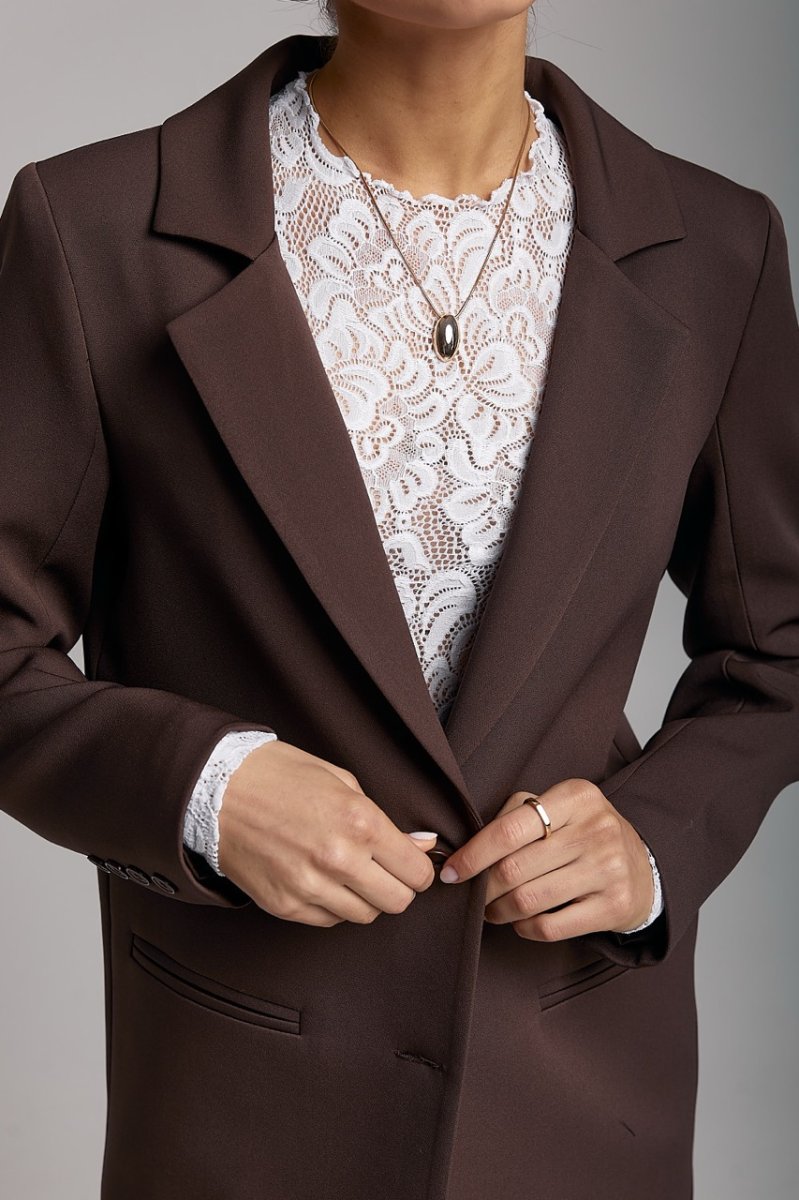 Піджак на підкладці, довжина нижче рівня стегон. Рукави вшивні, довгі, двошовні з ґудзиками на імітованій шліці. Кишені прорізні з обшивками. Комір піджачного типу, застібається на ґудзики, низ краю борту заокруглений.