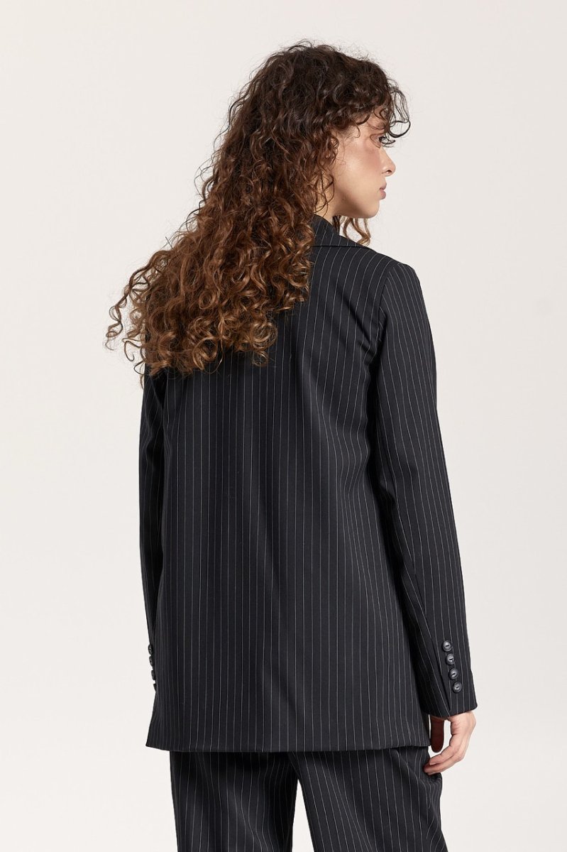 Піджак: двобортний, на підкладці, довжина нижче лінії стегон. Рукави вшиті, довгі, двошовні з ґудзиками на імітованій шліці. Кишені прорізні з обшивками. Комір піджачного типу, застібається на ґудзики, низ борту округлений.
