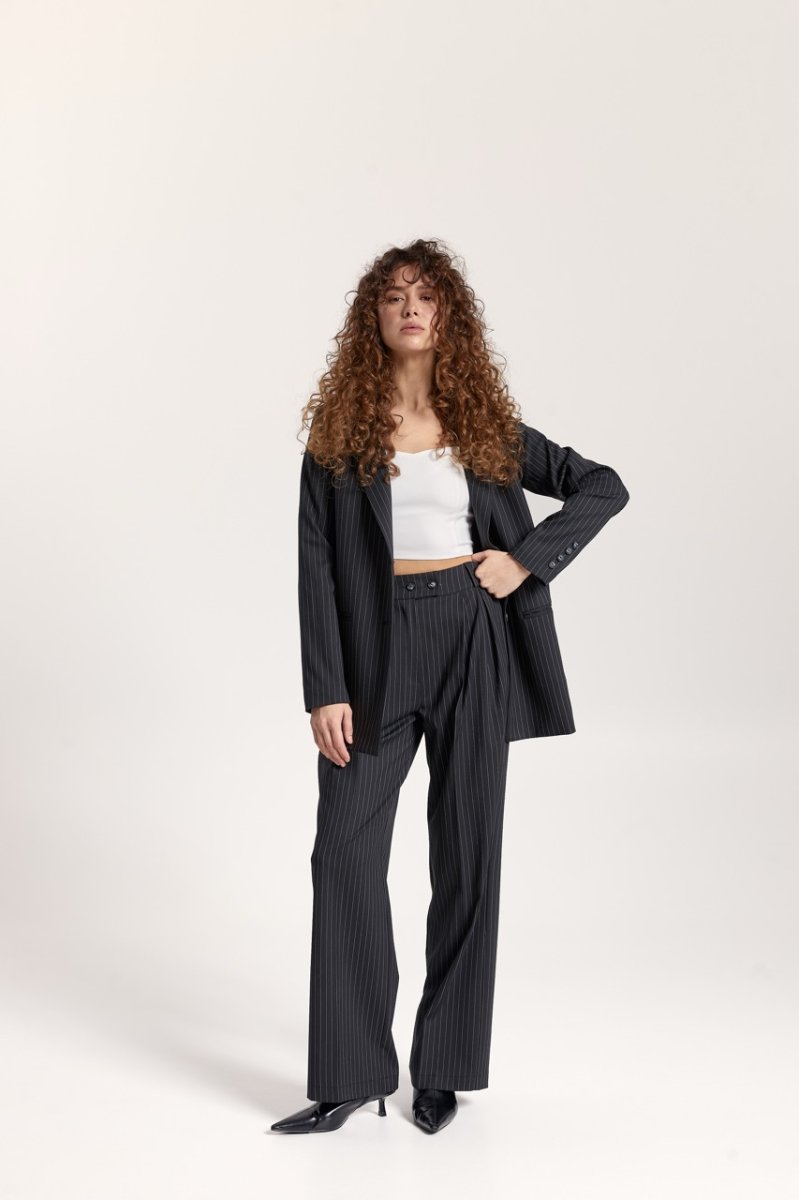Штани: прямого крою, на талії шльовки для знімного поясу. Застібка: ґудзик і прихована блискавка. Передні половинки зі стрілками та складками. Кишені розташовані в бічних швах. Задні половинки з виточками.