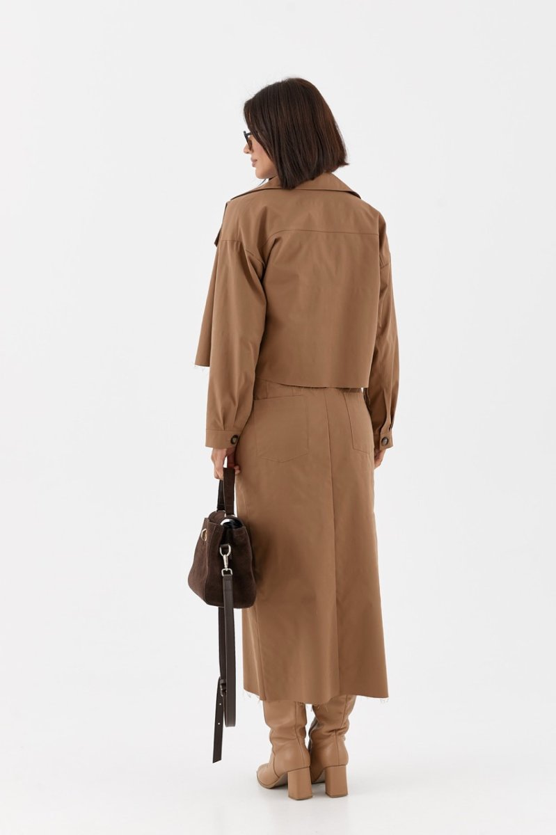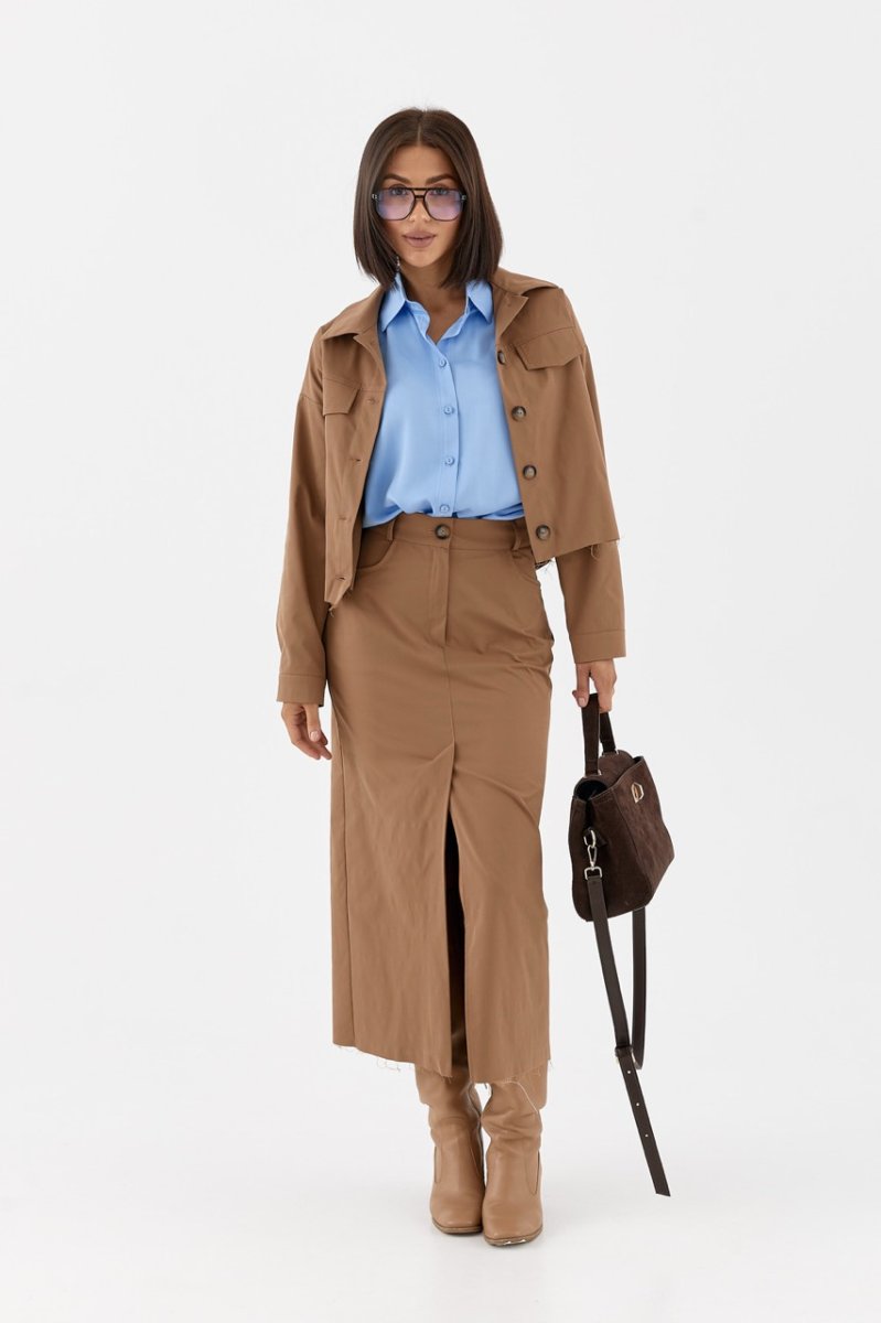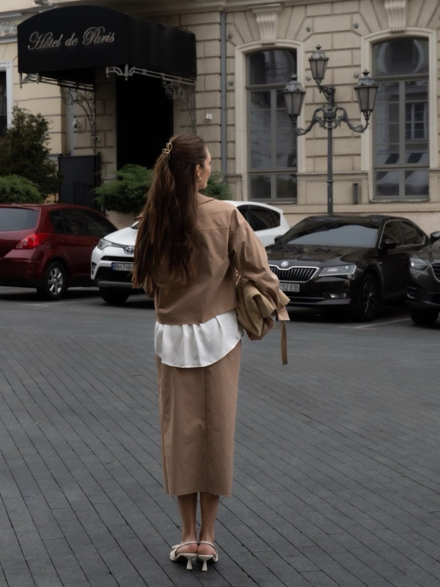 Спідниця: пряма, міді, з центральним розрізом спереду. Нижній край спідниці також необроблений, що гармонує з верхом.