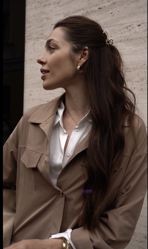Піджак: прямого крою з довгими рукавами. Має відкладний комір, накладні кишені на грудях та застібку на ґудзики спереду. Край виробу необроблений, трохи «рваний», що надає образу невимушеності.