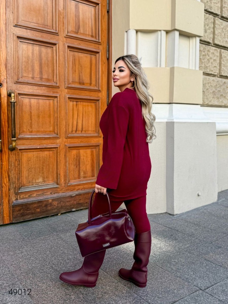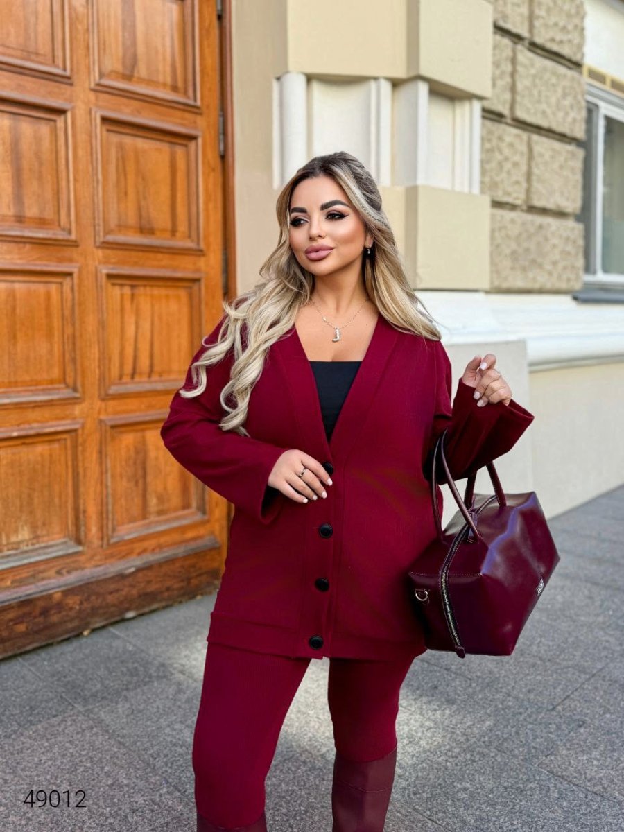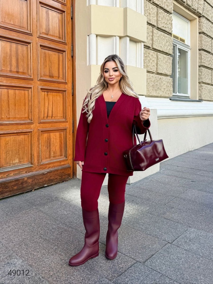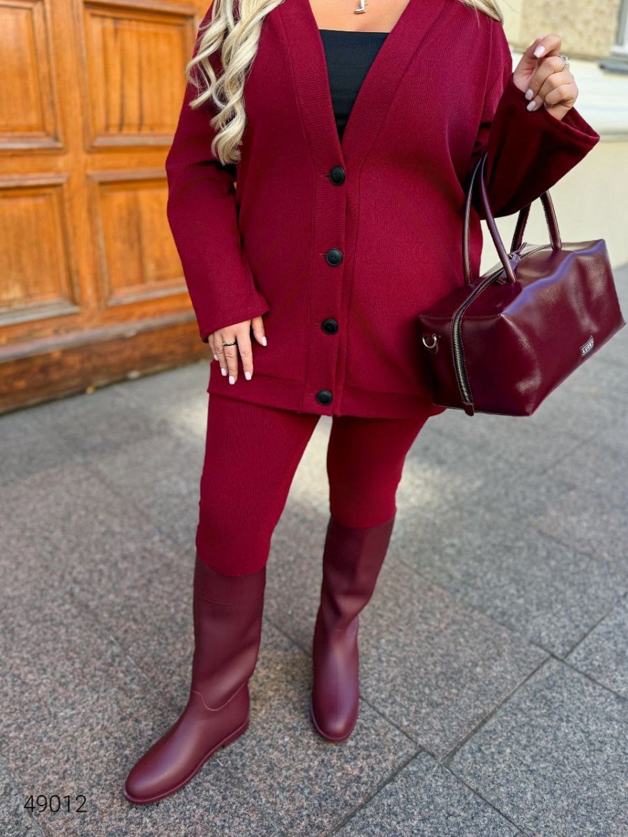 58-60: об'єм грудей - 130 см, довжина кофти - 79 см, довжина рукава - 62 см, об'єм талії - 94 см (розтягується до 106 см), об'єм стегон - 104 см (розтягується до 120 см), довжина легінсів - 95 см.