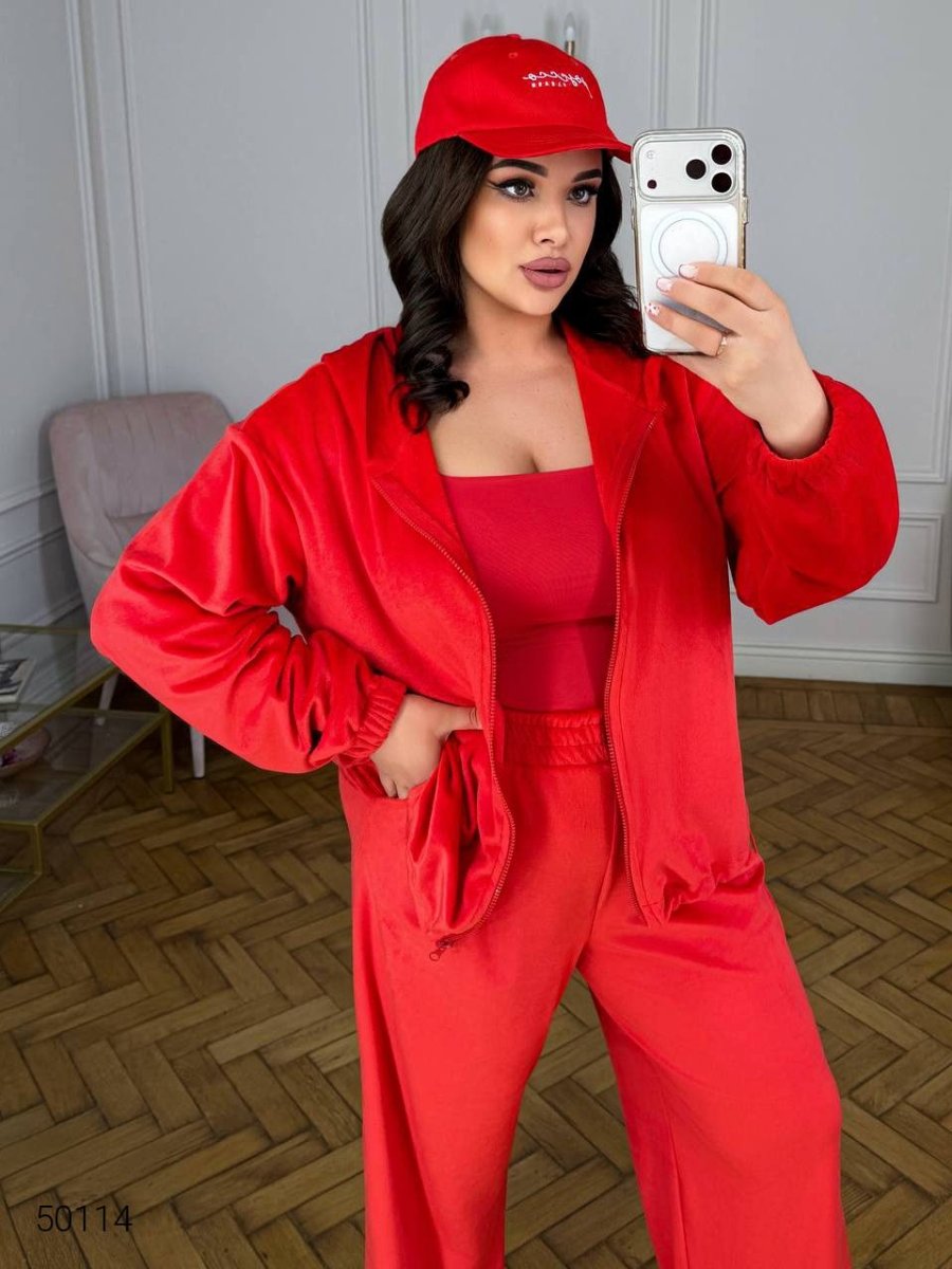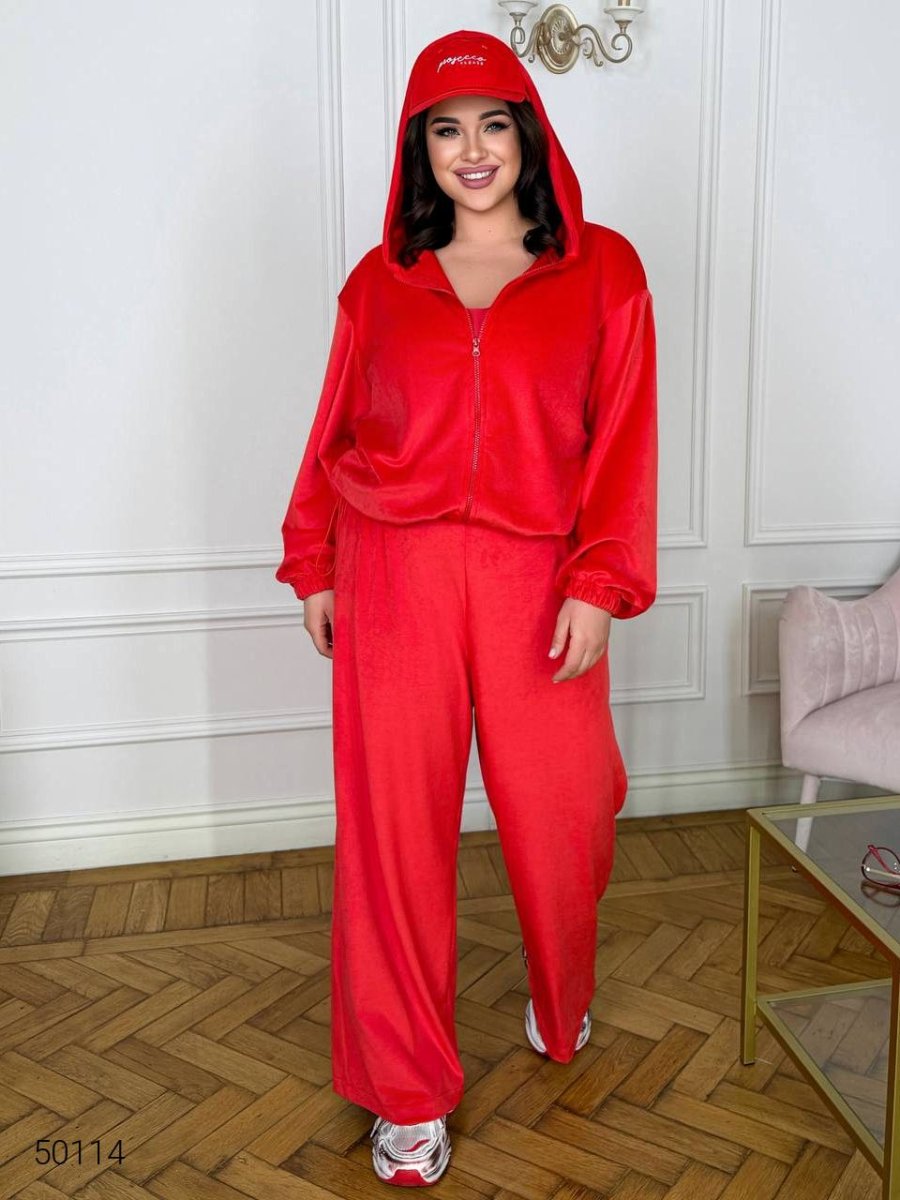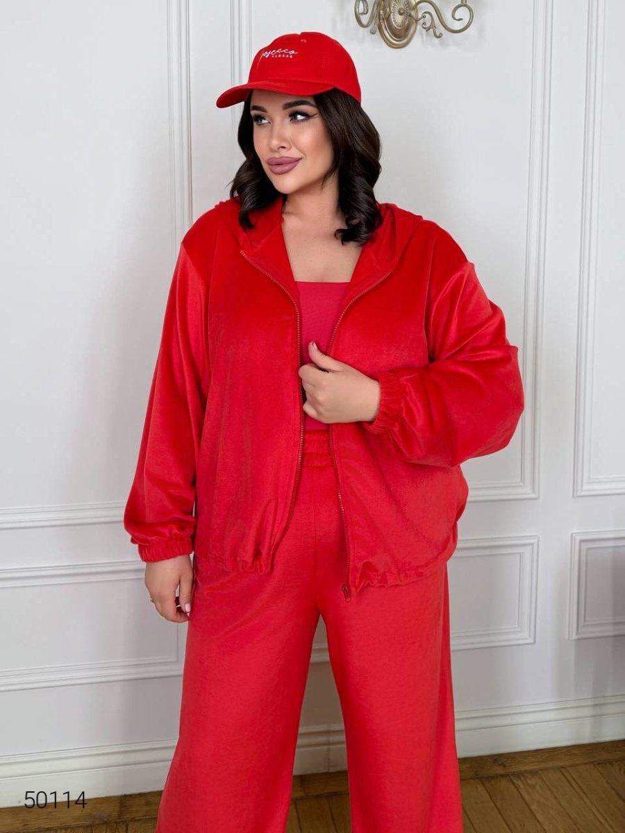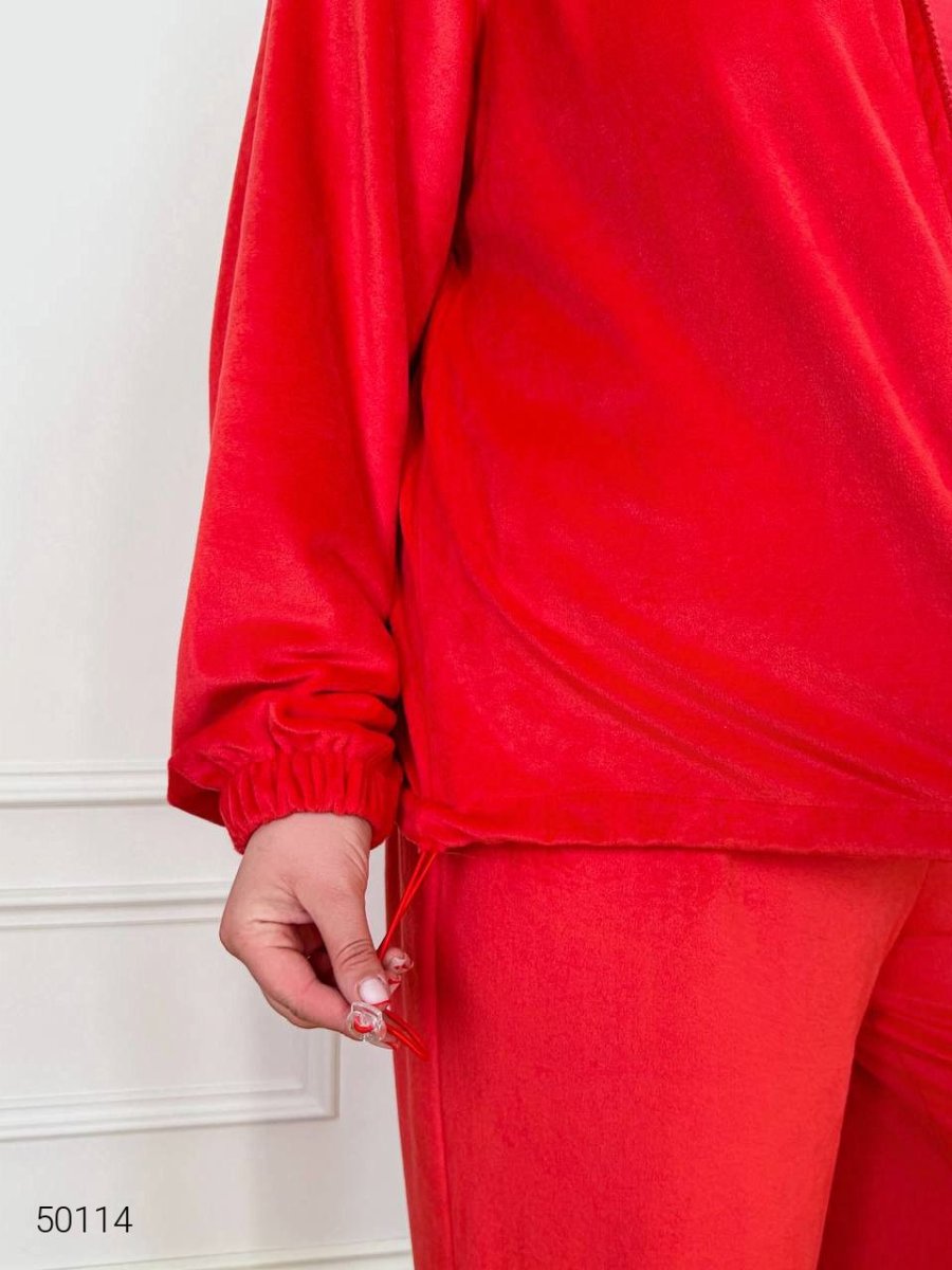 Жіночий велюровий костюм — комфортний і стильний комплект для повсякденного носіння. Кофта застібається на блискавку, з капюшоном; штани з поясом на резинці та зручними кишенями.