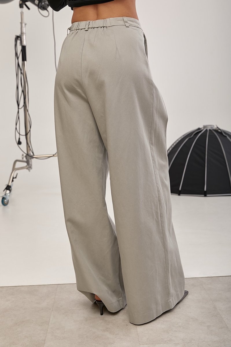 Втачний пояс іззаду доповнений еластичною резинкою для зручної посадки, а наявність петель дозволяє носити штани з ременем. Модель застібається на блискавку та застібку-гачок, має бічні врізні кишені для практичності. Ззаду під поясом розташовані виточки, які покращують посадку та підкреслюють фігуру.