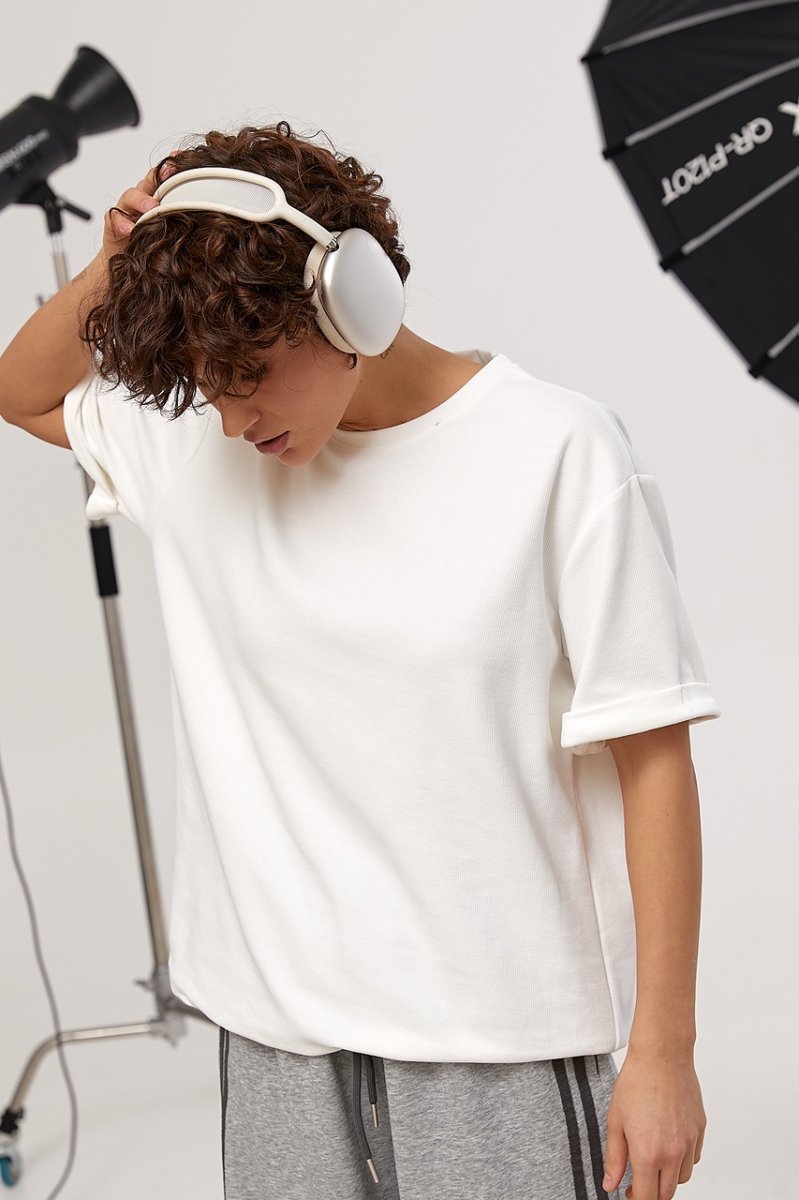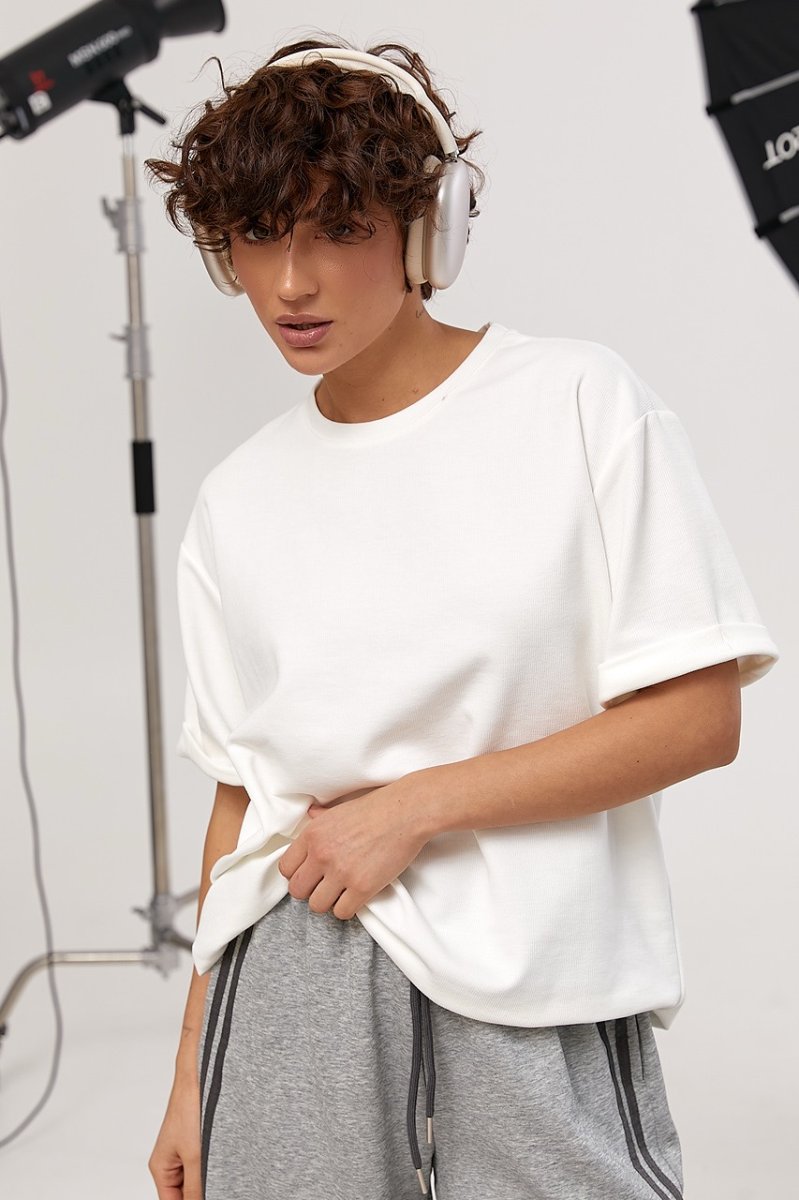 Однотонна футболка в рубчик вільного фасону — стильна базова модель для створення комфортних повсякденних образів. Фактурна тканина в рубчик надає виробу виразності та робить силует більш структурованим.