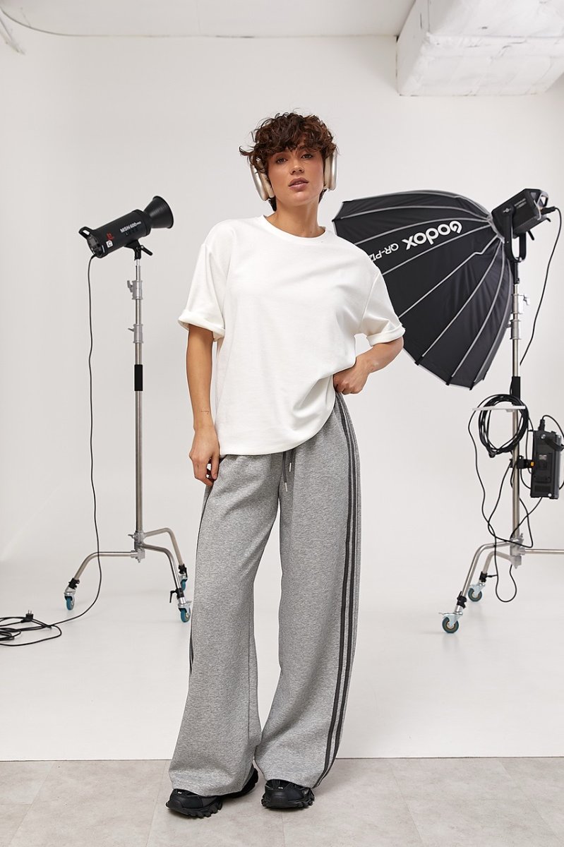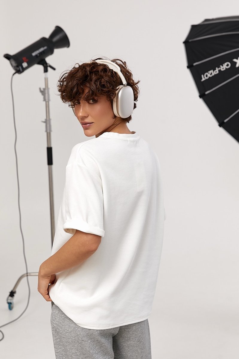 Футболка має класичну круглу горловину та прямий крій, що забезпечує зручну посадку і свободу рухів. Спущені пройми підкреслюють розслаблений характер моделі, а підгорнуті рукави додають легкого акценту та завершеності образу.