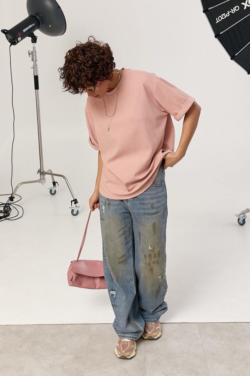 Футболка має класичну круглу горловину та прямий крій, що забезпечує зручну посадку і свободу рухів. Спущені пройми підкреслюють розслаблений характер моделі, а підгорнуті рукави додають легкого акценту та завершеності образу.