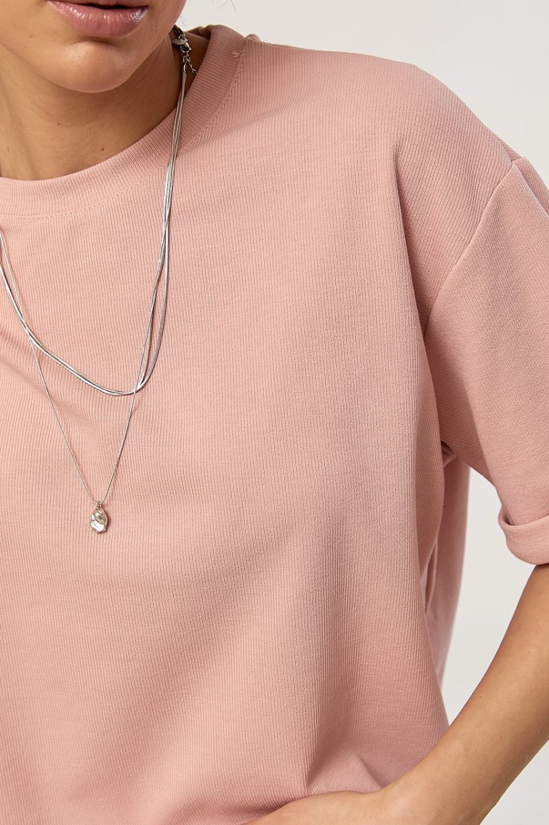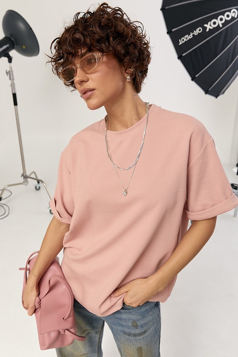 Однотонна футболка в рубчик вільного фасону — стильна базова модель для створення комфортних повсякденних образів. Фактурна тканина в рубчик надає виробу виразності та робить силует більш структурованим.
