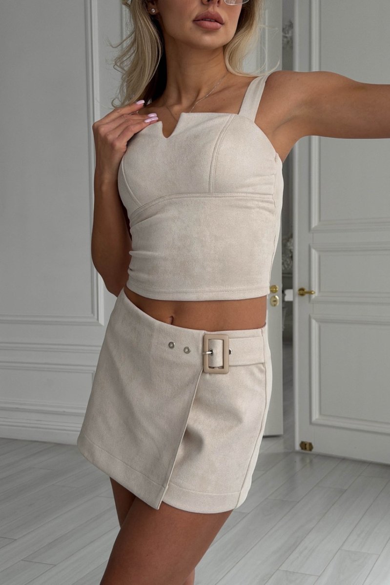 Топ з еко-замші з приталеним силуетом — стильна базова модель з акцентом на фактуру. М’яка та приємна до тіла тканина добре тримає форму й підкреслює фігуру. Лаконічний крій робить топ універсальним для поєднання з бомберами, спідницями чи брюками.