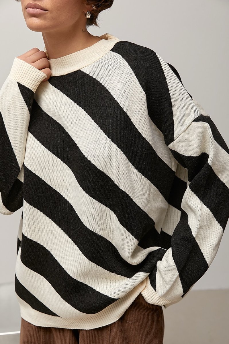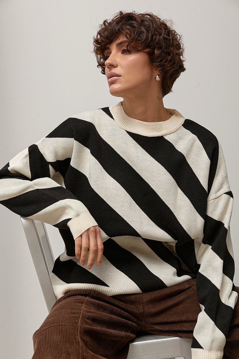 Трикотажна в’язана кофта у діагональну смужку — стильна модель із цікавим фактурним акцентом. Візерунок у діагональ візуально динамізує силует і додає виробу сучасного характеру.