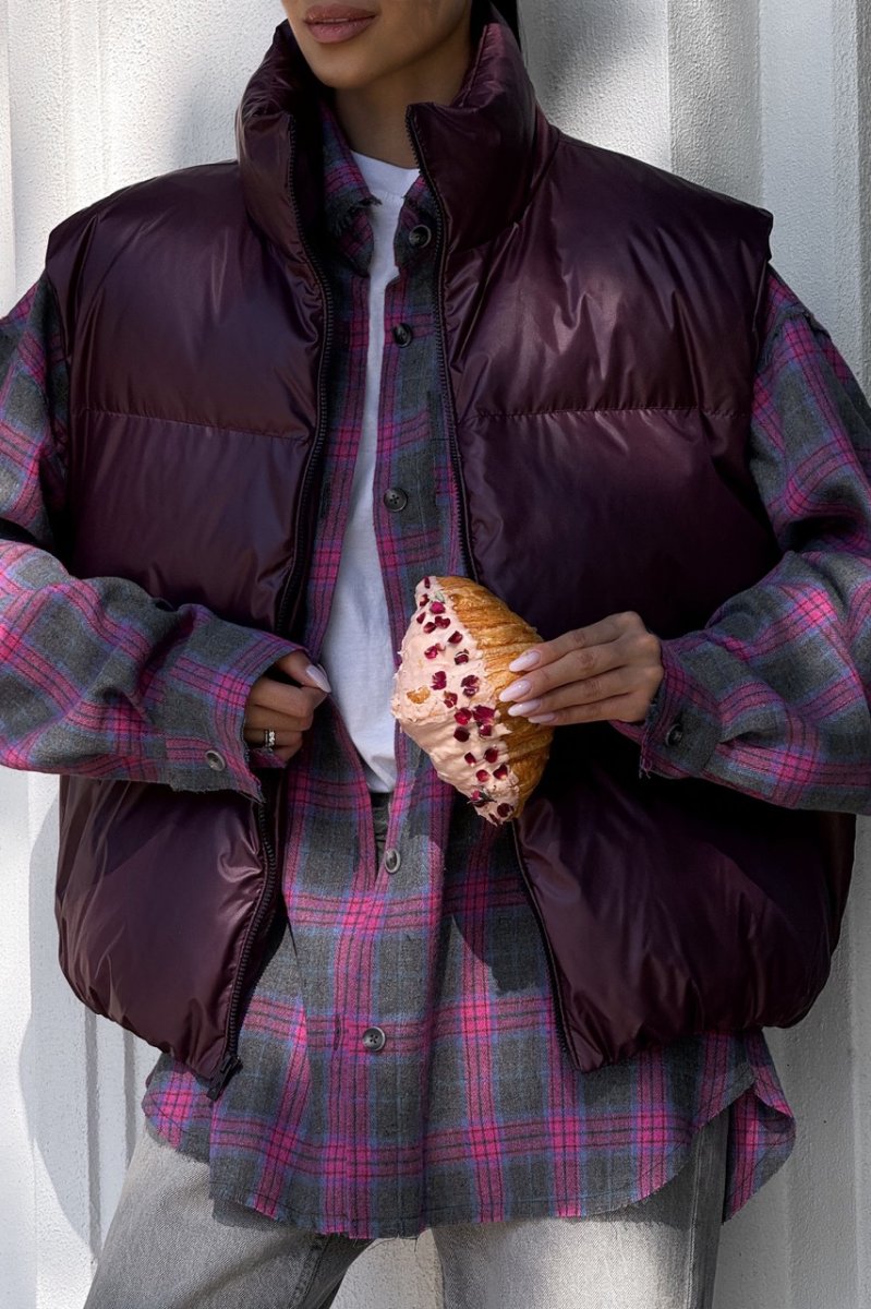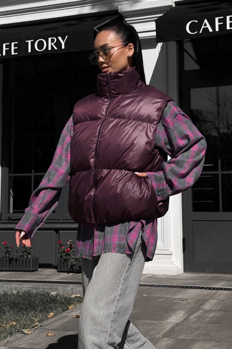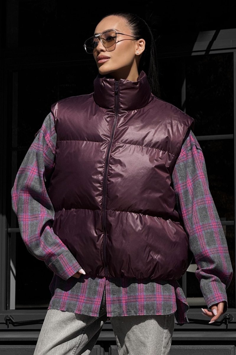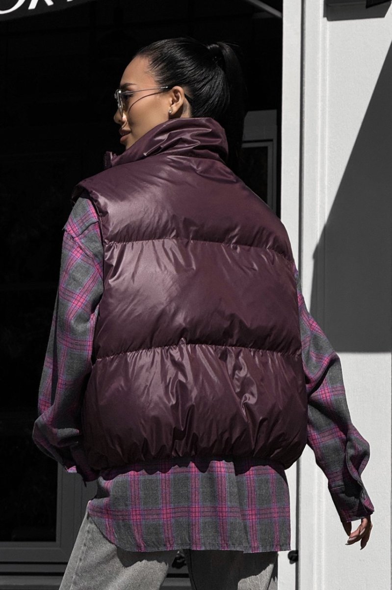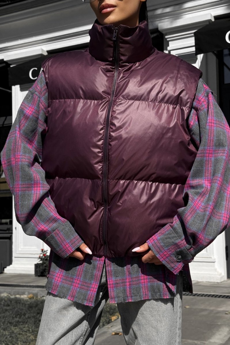 Універсальна модель жилетки на кожен день із коміром-стійкою. Застібається на блискавку, по низу – резика, по бокам – кишені на блискавці. Наповнювач – екопух.