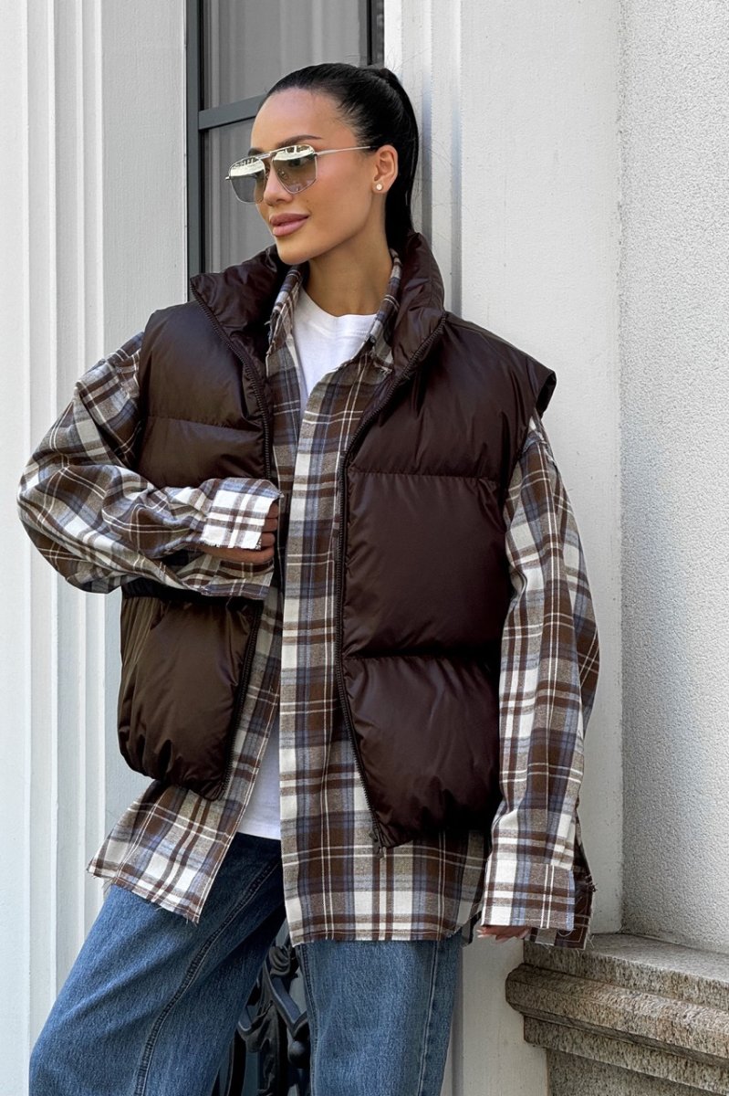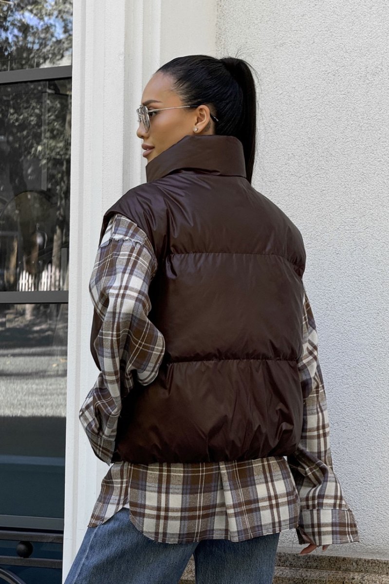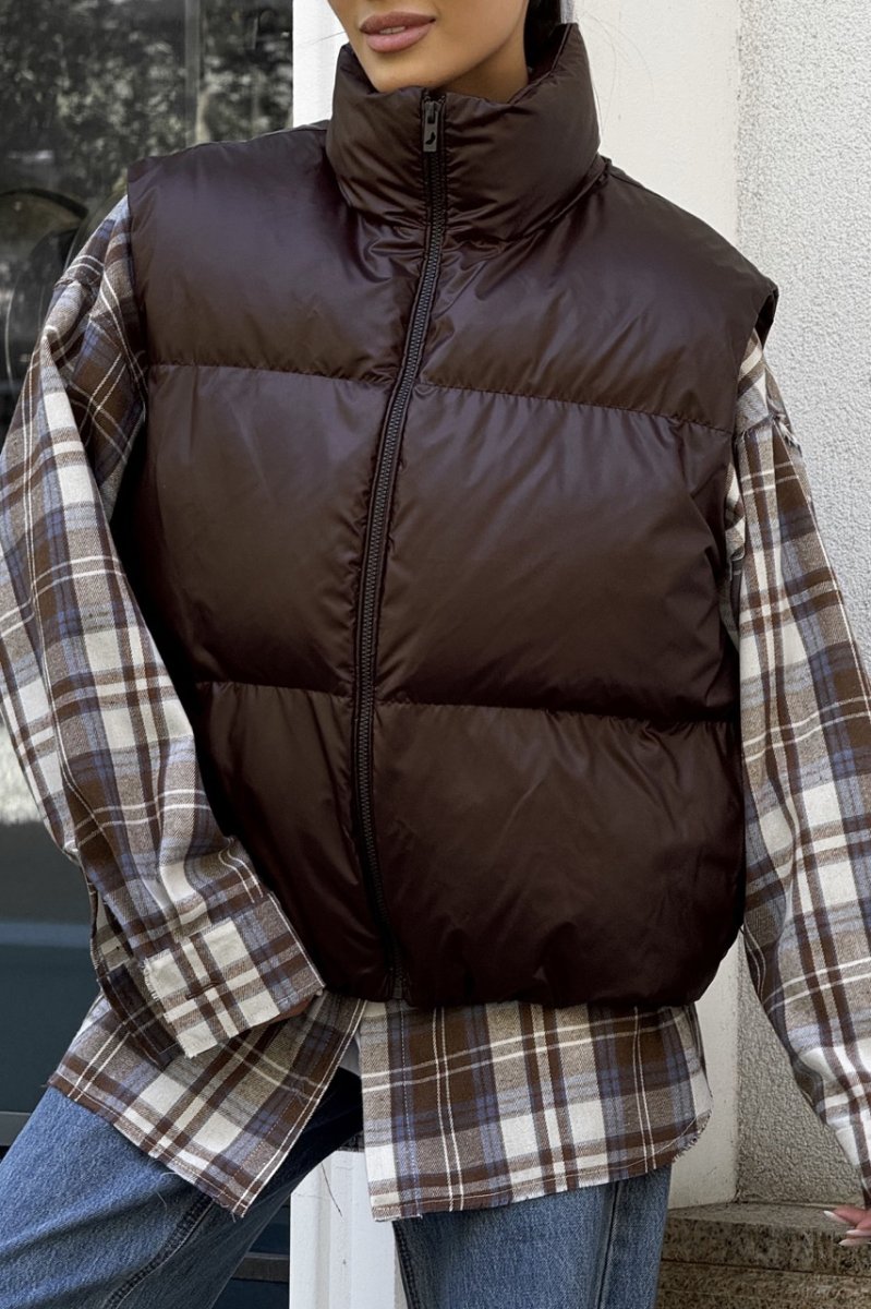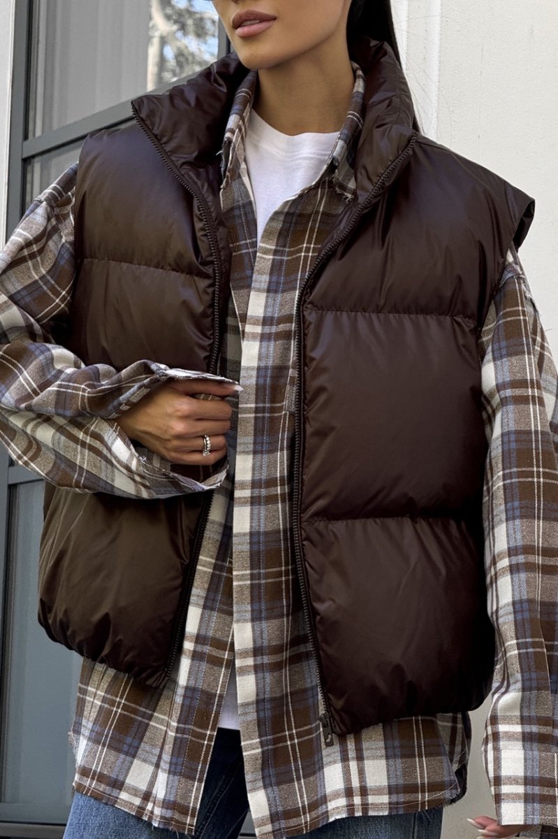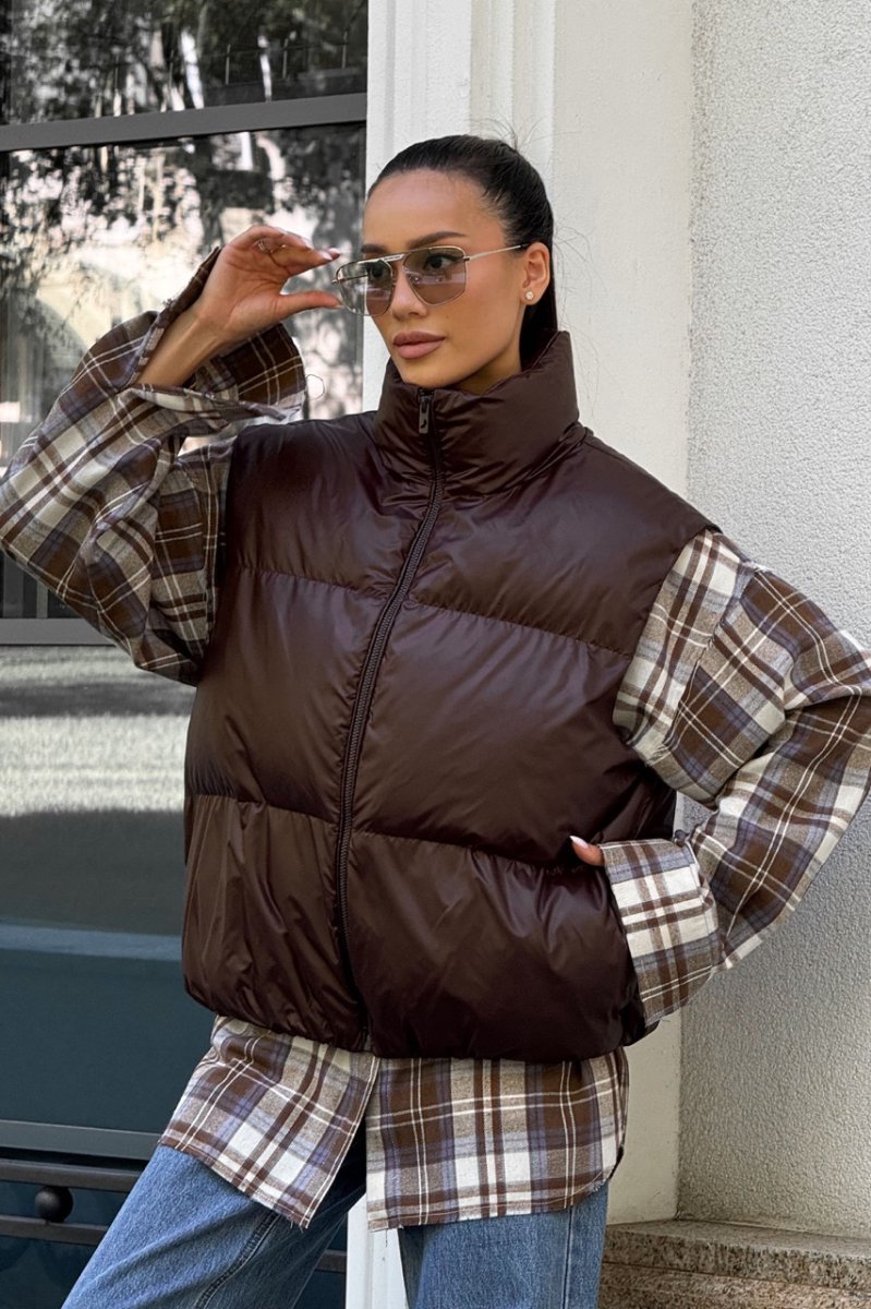 Універсальна модель жилетки на кожен день із коміром-стійкою. Застібається на блискавку, по низу – резика, по бокам – кишені на блискавці. Наповнювач – екопух.