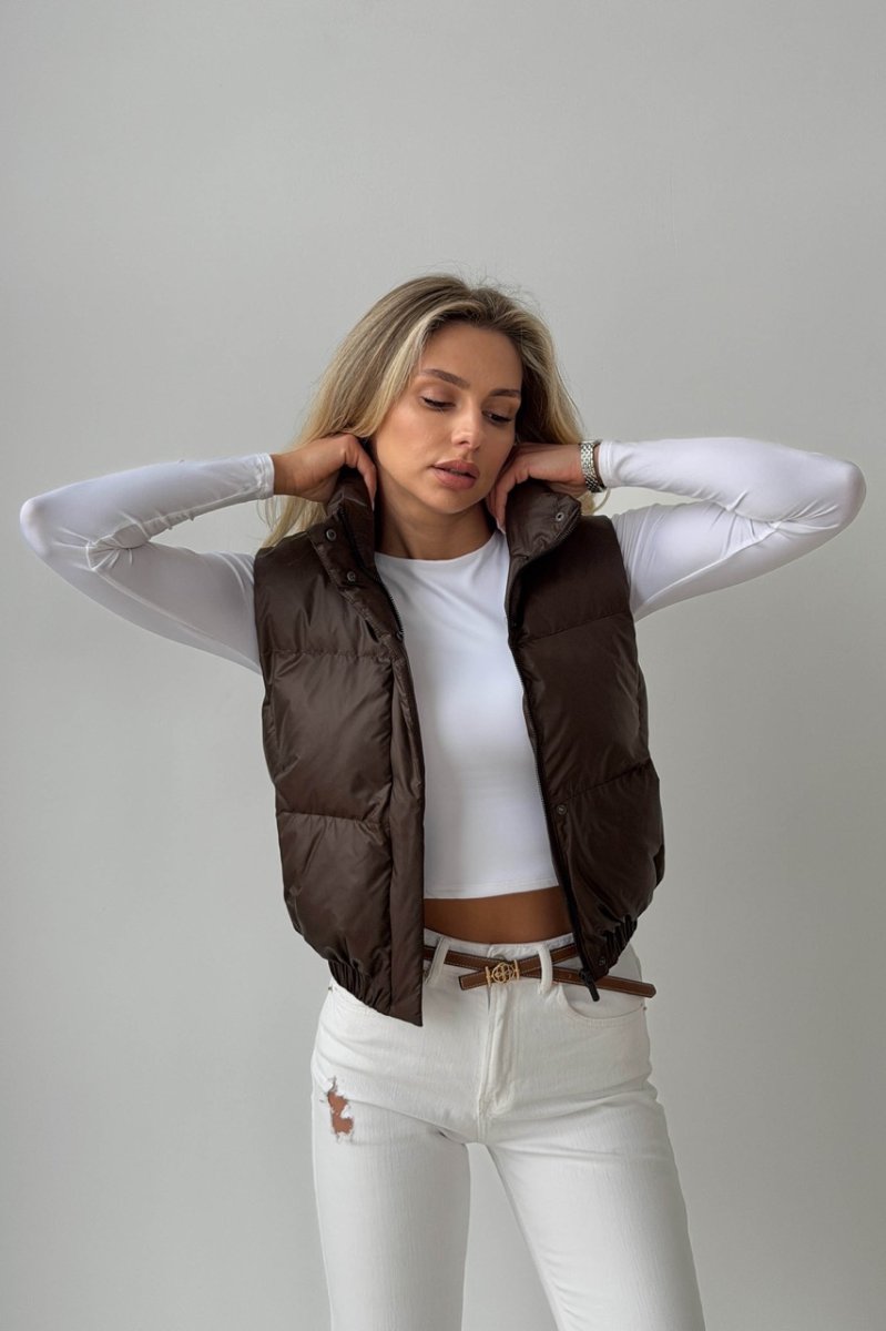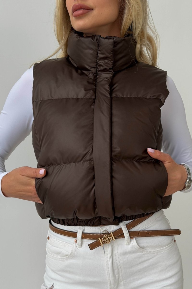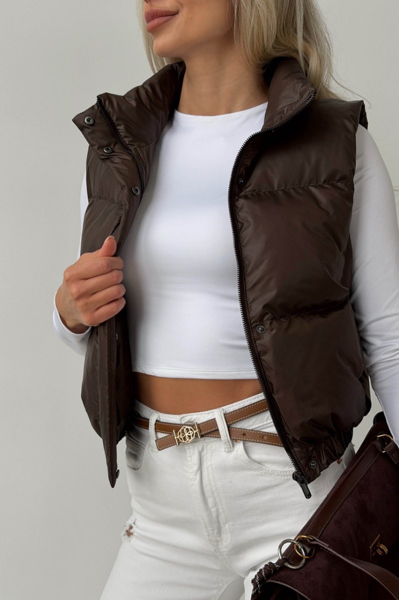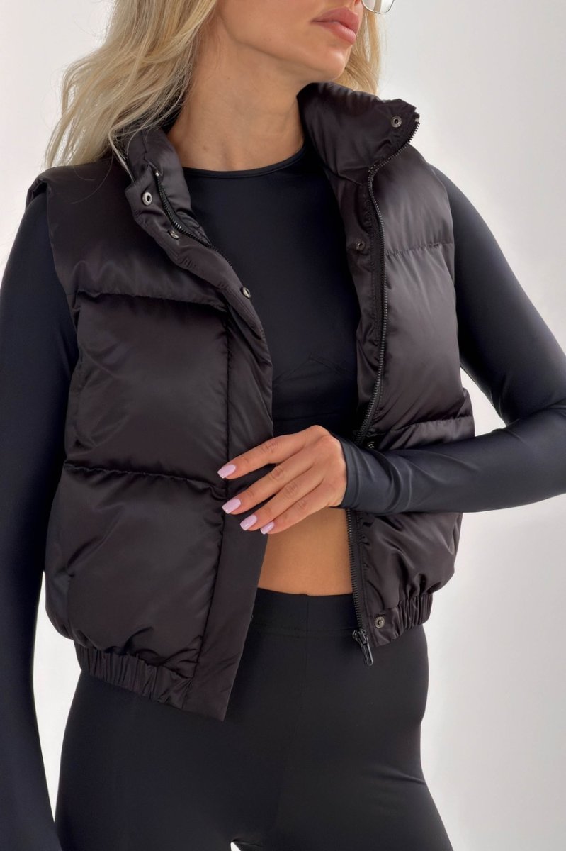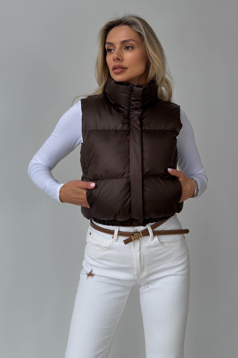 Укорочений жилет — функціональний акцент для динамічних образів. Прямий силует візуально підкреслює талію та ідеально поєднується з брюками або джинсами з високою посадкою. Виконаний із плащової тканини на жакардовій підкладці з наповнювачем біопух — легкий, теплий і комфортний у носінні. Комір-стійка захищає від вітру, а застібка на блискавку доповнена планкою на кнопках.