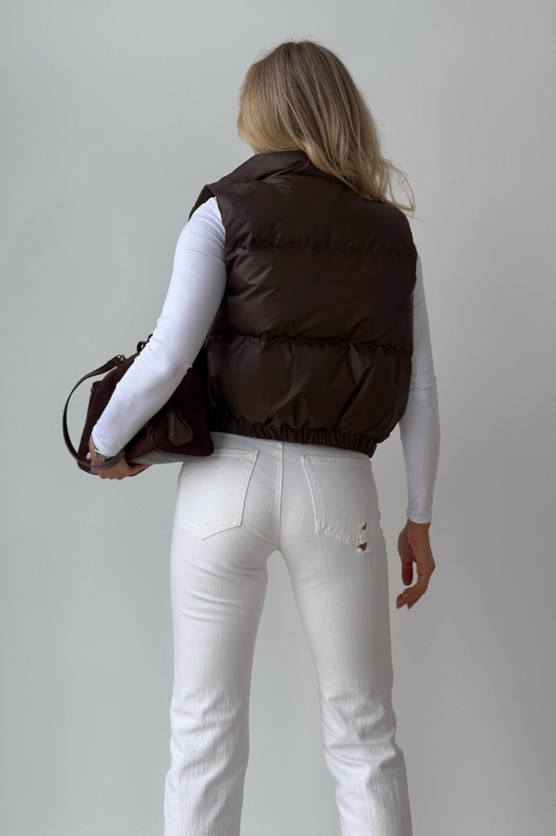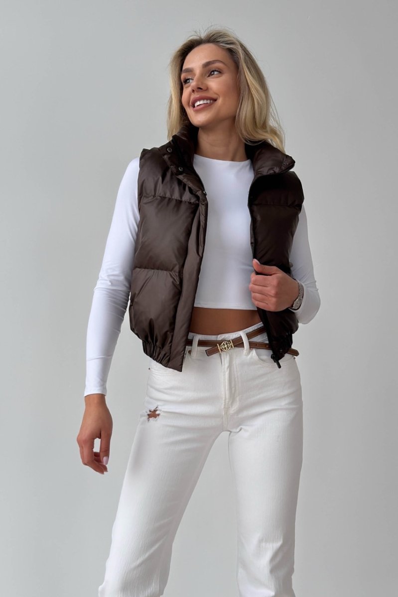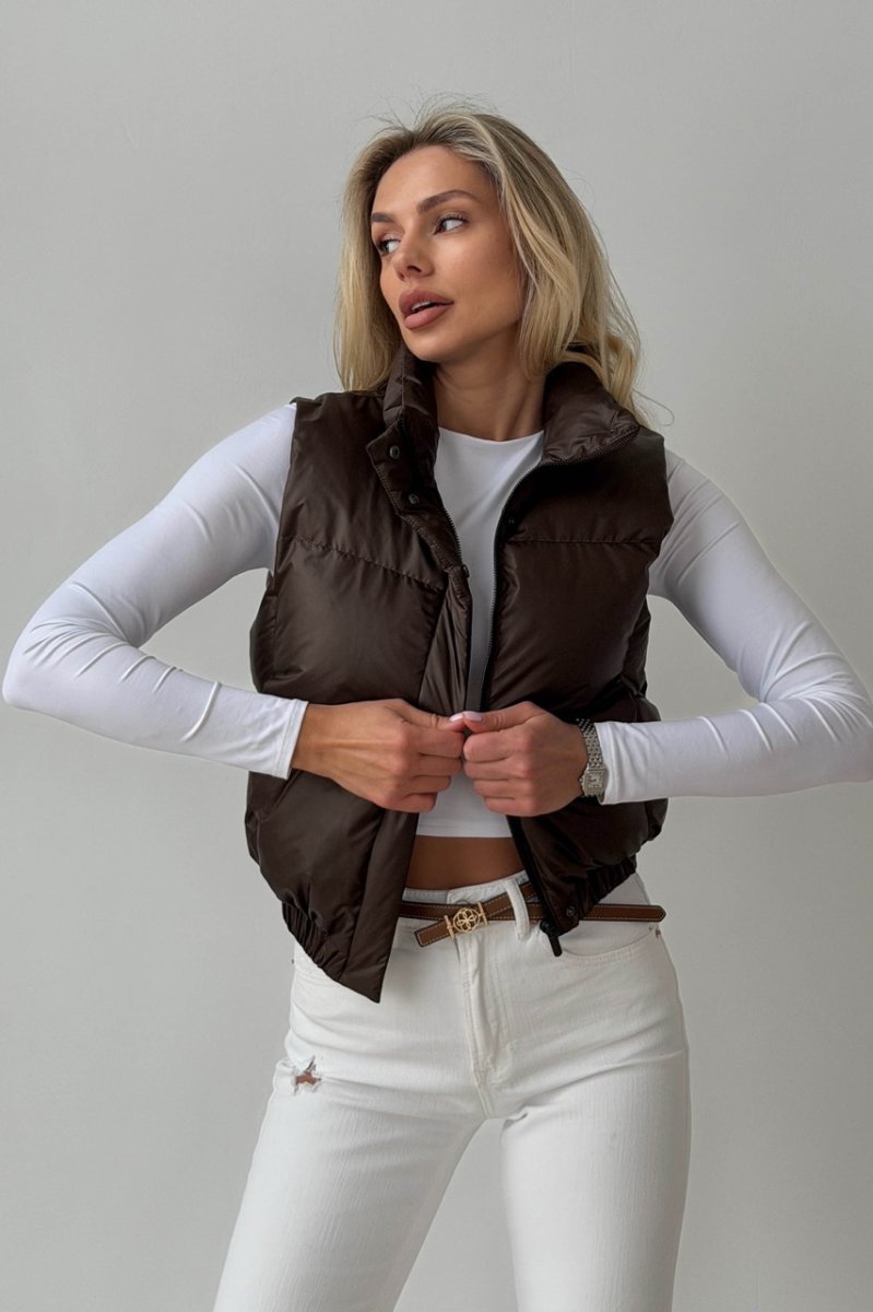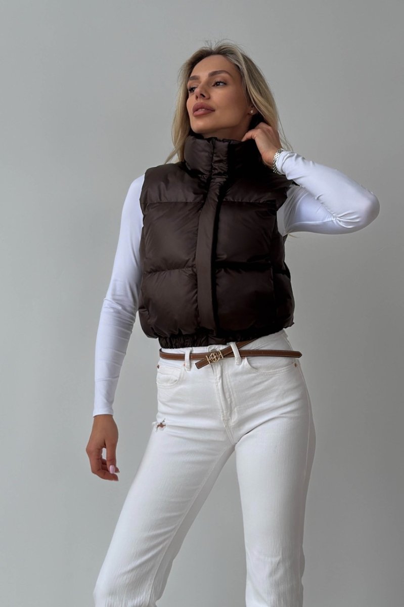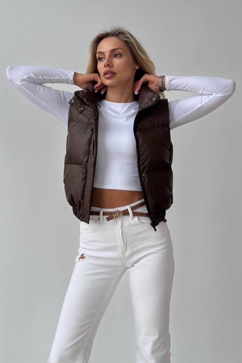 Укорочений жилет — функціональний акцент для динамічних образів. Прямий силует візуально підкреслює талію та ідеально поєднується з брюками або джинсами з високою посадкою. Виконаний із плащової тканини на жакардовій підкладці з наповнювачем біопух — легкий, теплий і комфортний у носінні. Комір-стійка захищає від вітру, а застібка на блискавку доповнена планкою на кнопках.