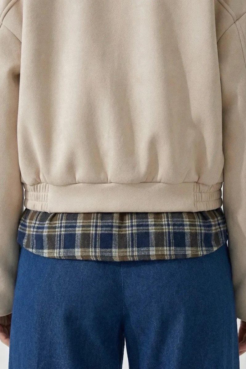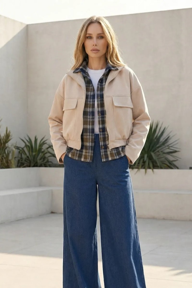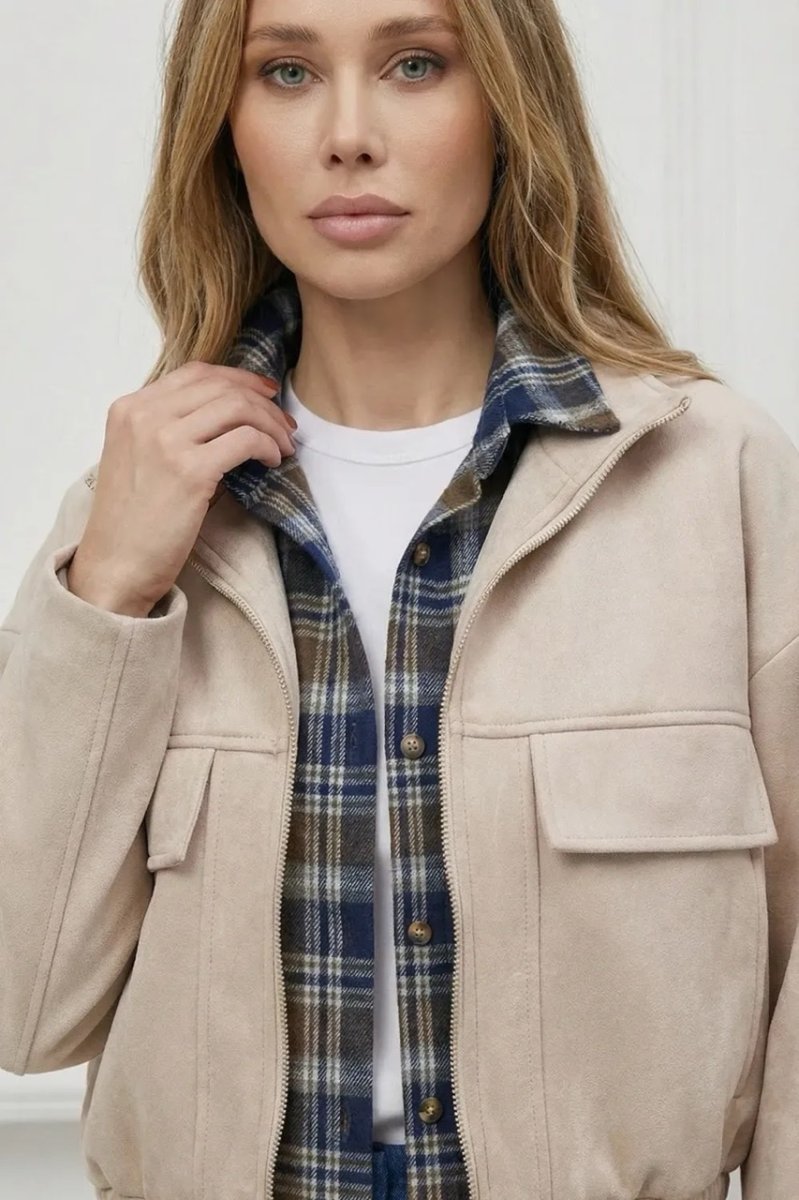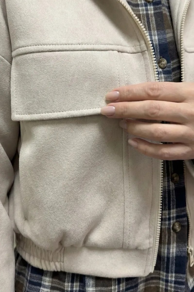 Стильный демисезонный бомбер из мягкой светлой замши с накладными клапанами и спущенным рукавом.