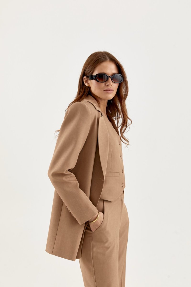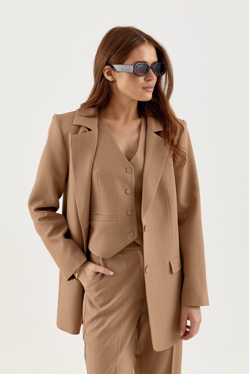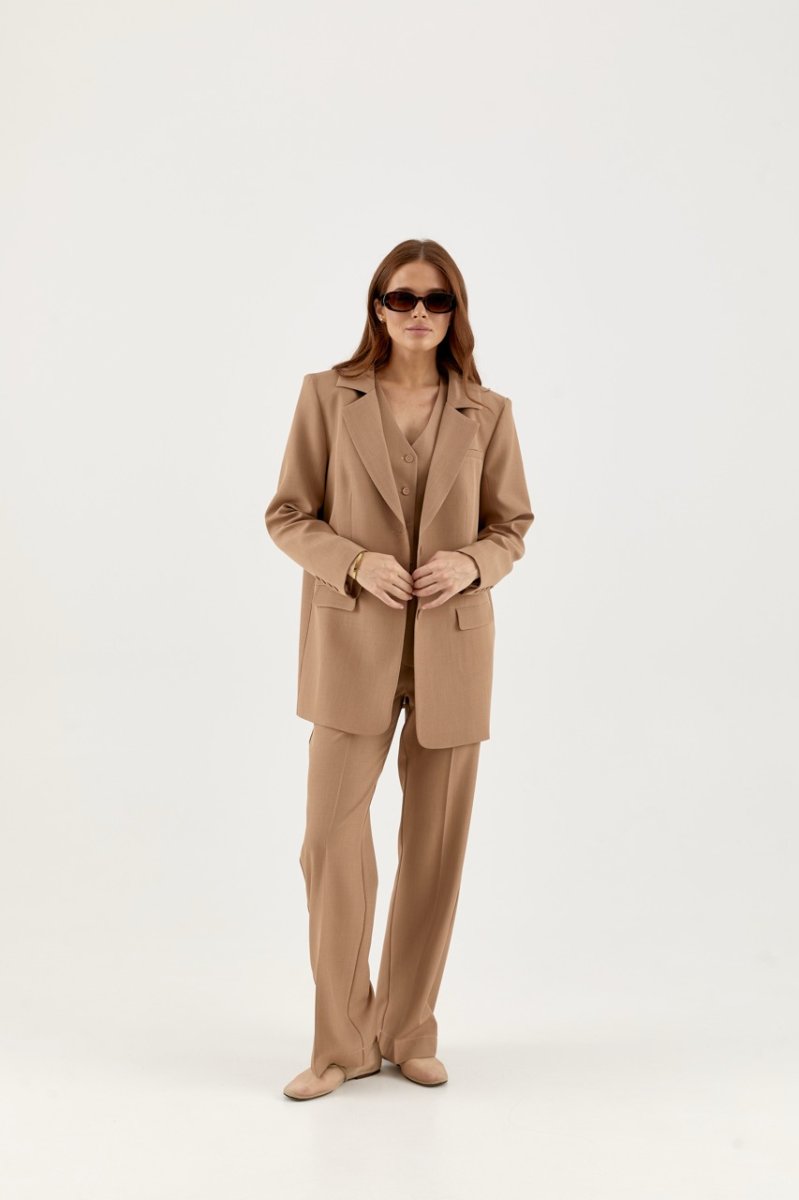 Элегантный карамельный женский пиджак классического кроя – универсальная база для стильного и современного гардероба. Выполнен из качественной костюмной ткани, держит форму и обеспечивает комфорт в течение дня. Модель имеет свободный силуэт с акцентом на плечах, лацканы средней ширины, застёжку на пуговицы и карманы с клапанами. Насыченный цвет делает пиджак идеальным как для офисных луков, так и для вечерних образов. Легко сочетается с брюками, юбками и платьями, добавляя элегантности и уверенности.