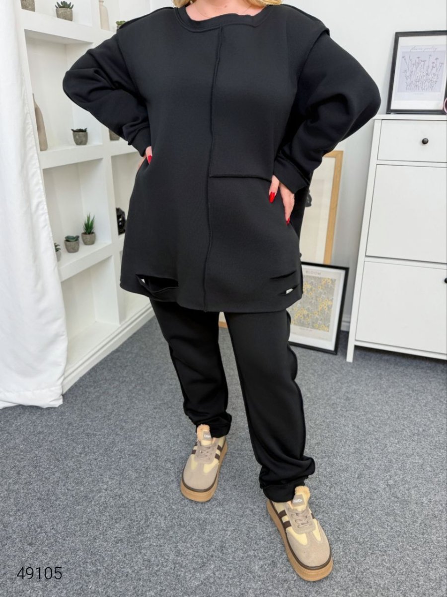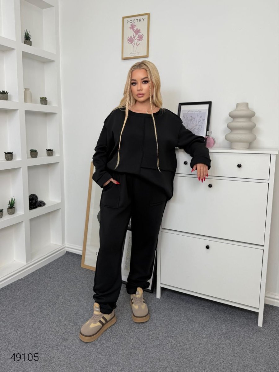 Костюм женский. Свитшот без капюшона, с декоративными швами наружу. Брюки с карманами, на поясе на резинке, снизу манжет.