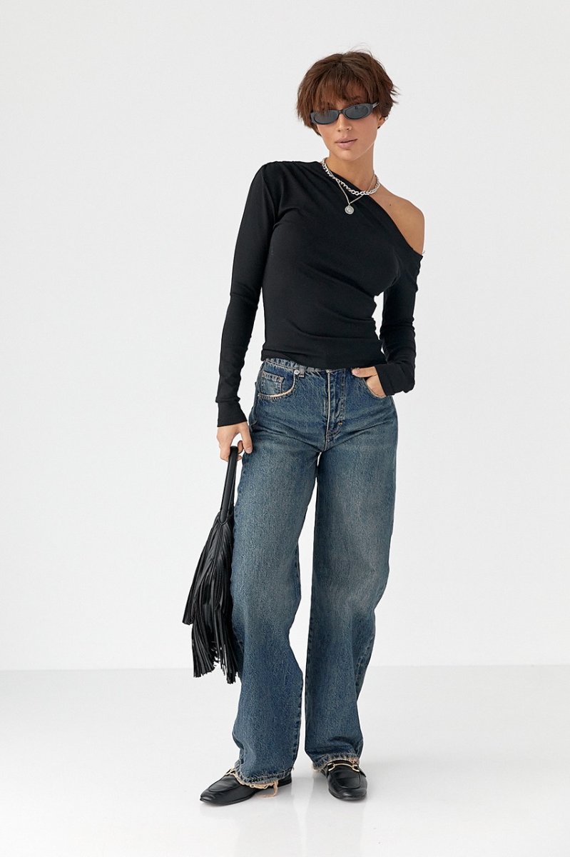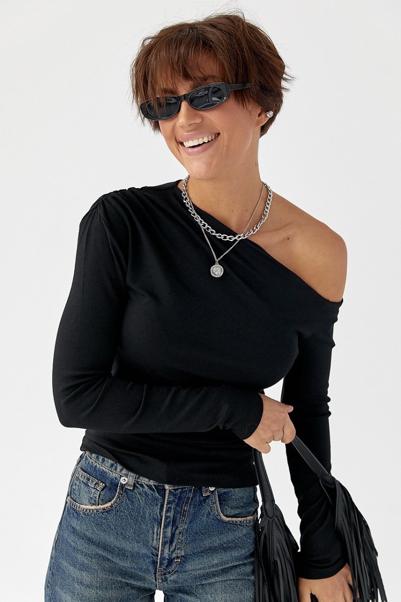 Изделие имеет плотный приталенный крой и длинные рукава, придающие образу сдержанной изысканности. Открытое плечо создает оригинальный акцент, а драпировка на закрытой стороне придает деликатную текстурность и объем. Прямой низ сохраняет чистоту линий и позволяет легко заправлять лонгслив в пояс или носить навыпуск.