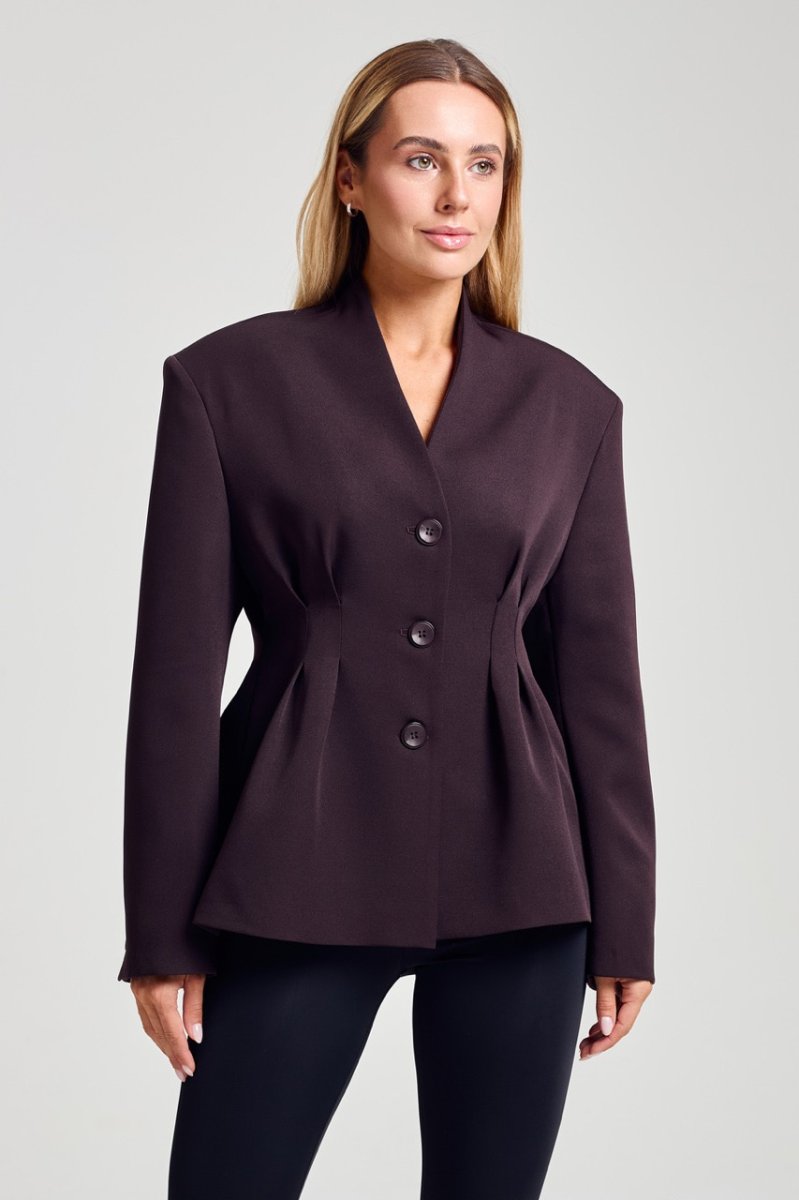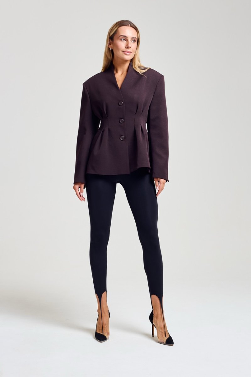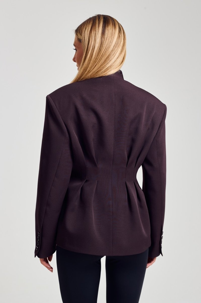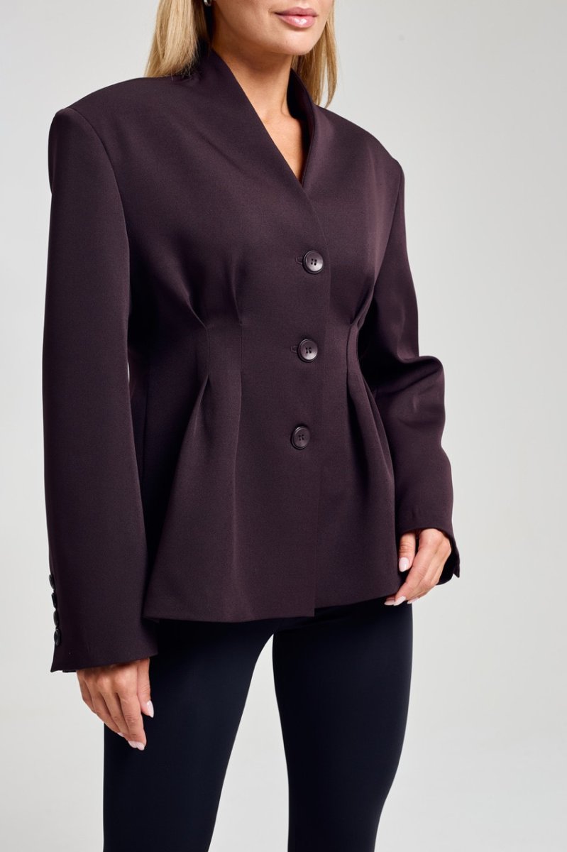 Пиджак приталенного силуэта с защелками по талии спереди и сзади формируют элегантный силуэт. Модель отличается интересным кроем воротника и акцентом на линии талии с мягким разрешением в зоне бедер. Благодаря сочетанию четкого кроя и свободной посадки пиджак выглядит как аккуратный оверсайз. Стильное решение в трендовом исполнении.