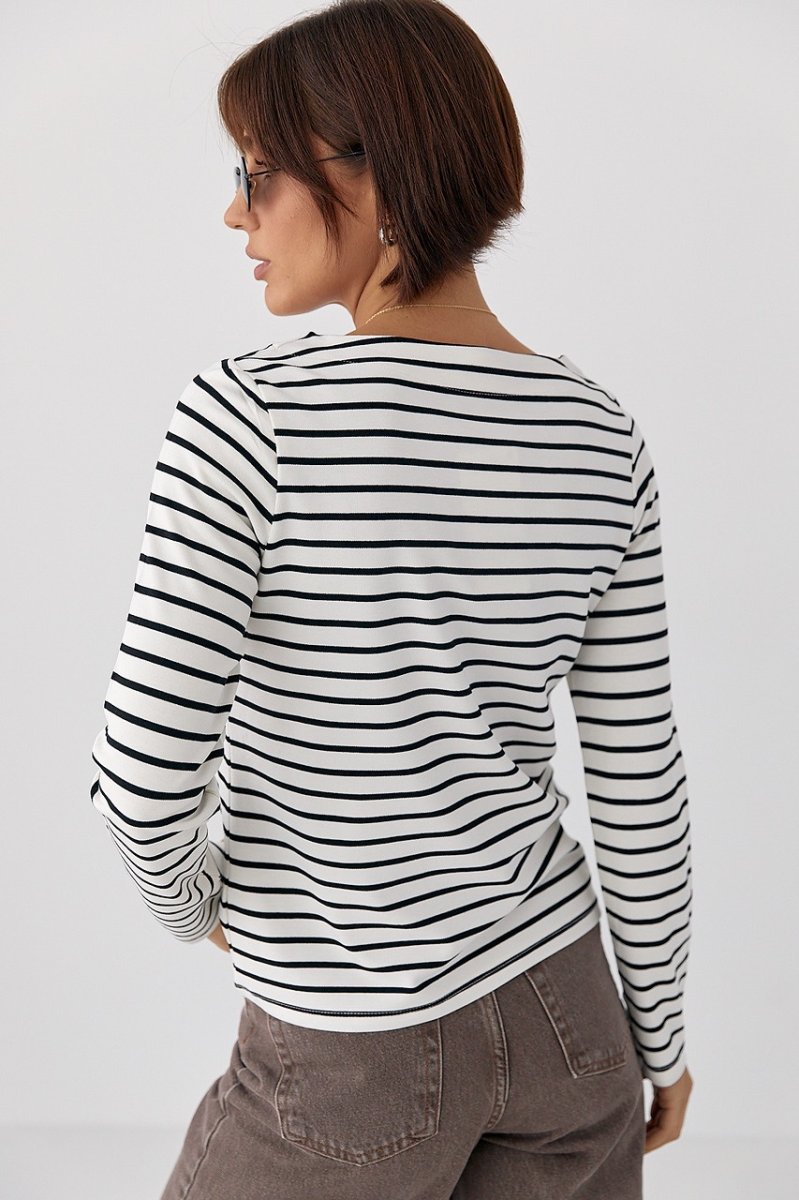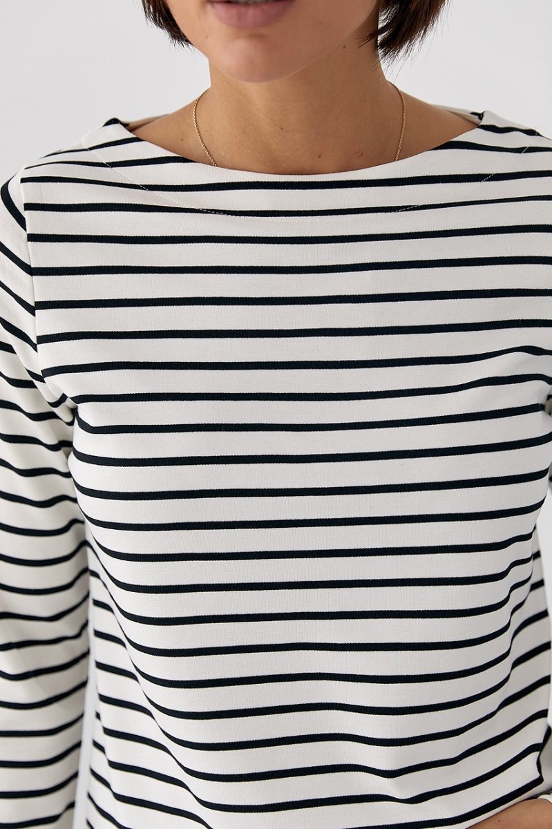 Модель имеет полуприталенный, но вместе с тем прямой крой, подчеркивающий силуэт и не сковывающий движений. Классическая круглая горловина и прямой низ придают лонгу лаконичности, а длинные широкие рукава создают легкий акцент на современный oversize-эффект. Контрастные полосы придают изделию динамики и делают образ более выразительным.