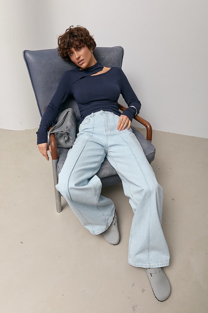 Трикотажный лонгслив с вырезом на плече 0690 темно-синий