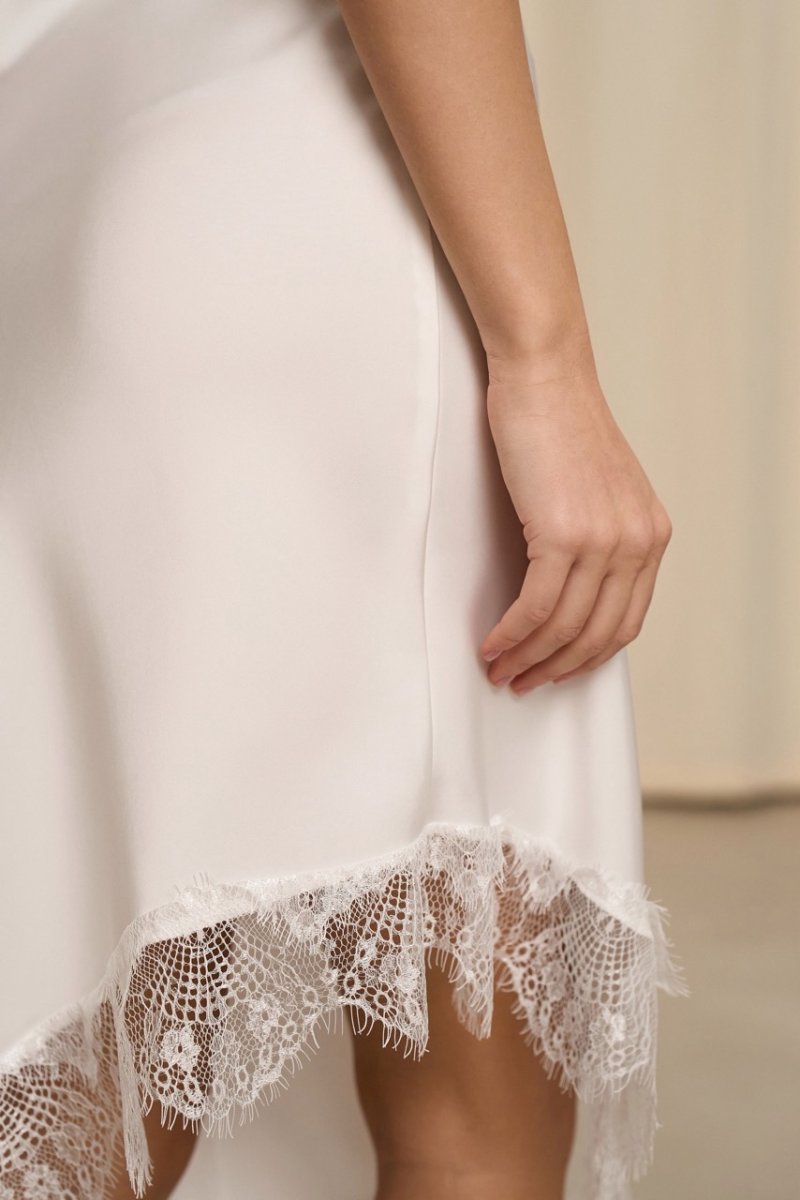 Это утончённое молочное платье на тонких бретелях создано для женщин, которые ценят лёгкость, элегантность и современный минимализм. Силуэт-комбинация с мягким V-образным вырезом аккуратно подчёркивает линию декольте, а нежный атлас красиво ложится по фигуре. Асимметричный подол, украшенный воздушным кружевом, добавляет образу утончённости и изысканного движения. Благодаря такой детали модель выглядит особенно празднично и оригинально.