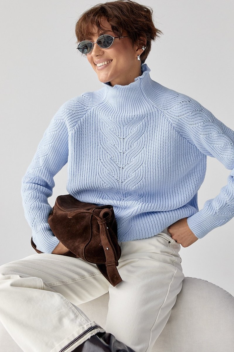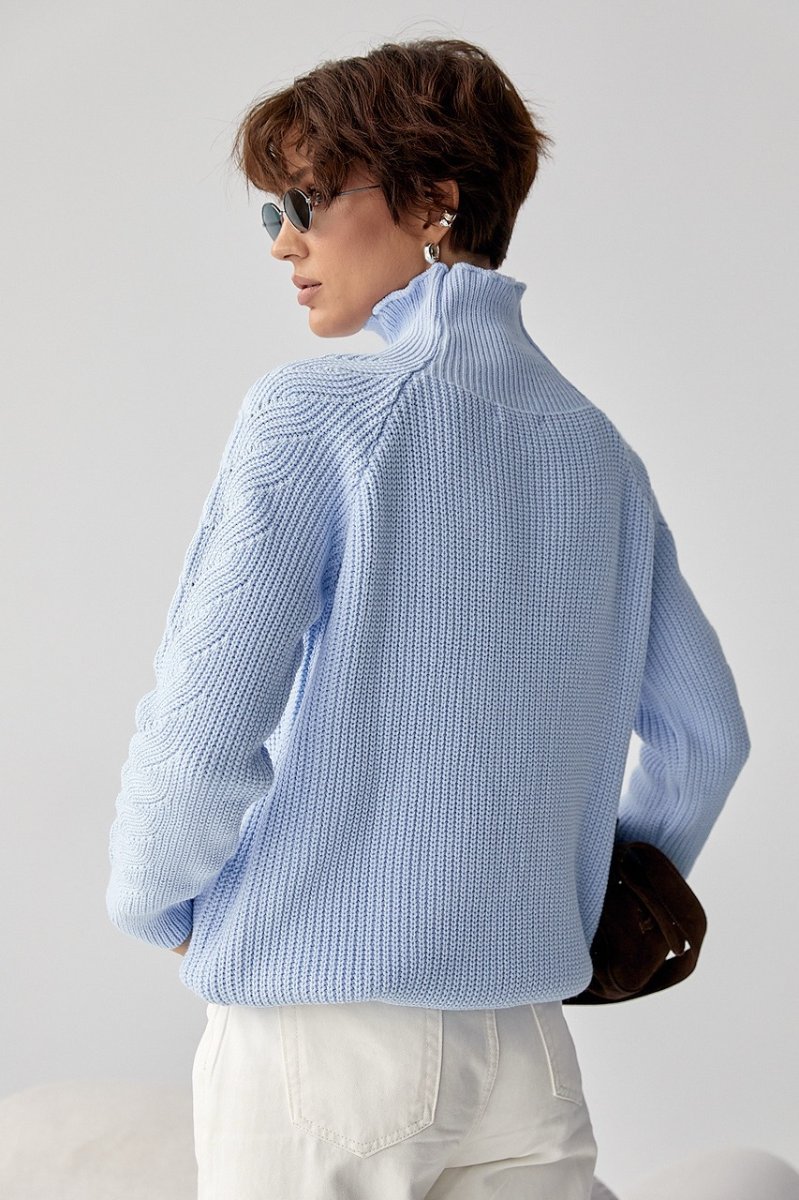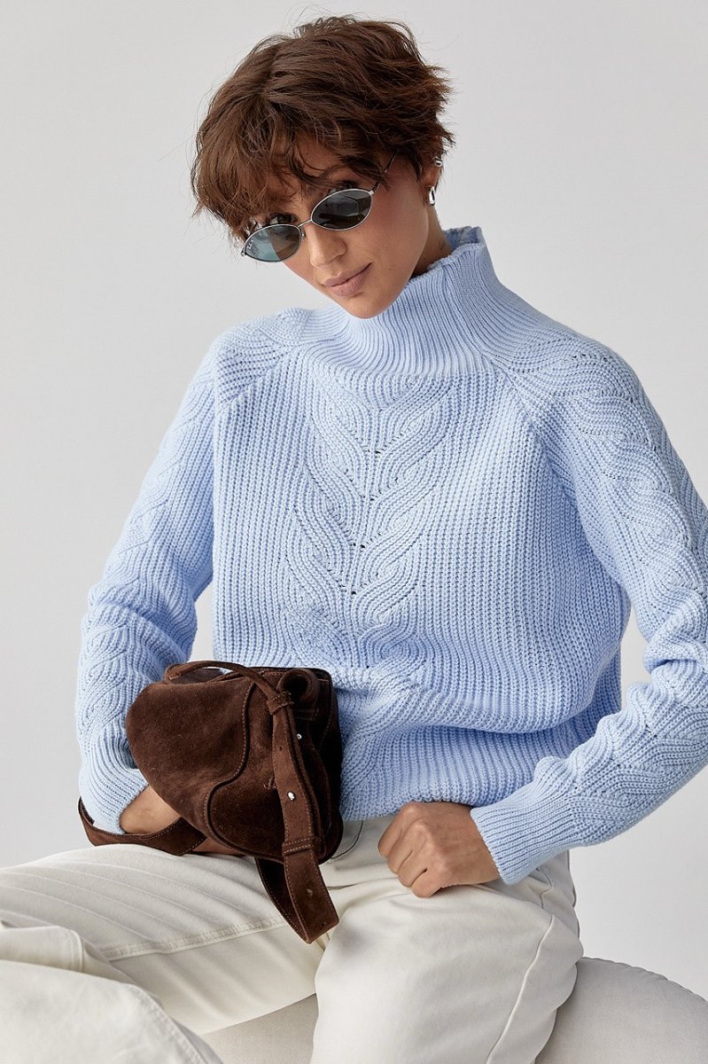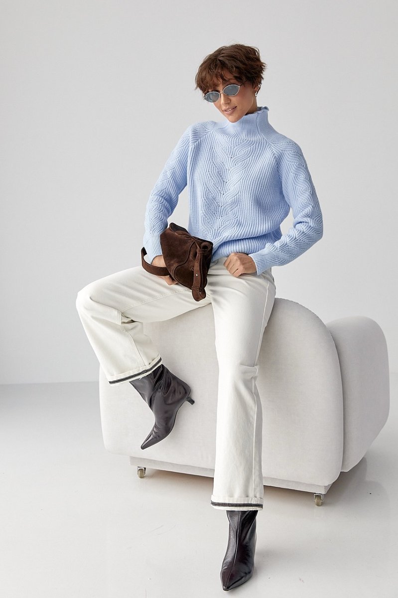 Вязаный женский свитер с косичками 260525 голубой