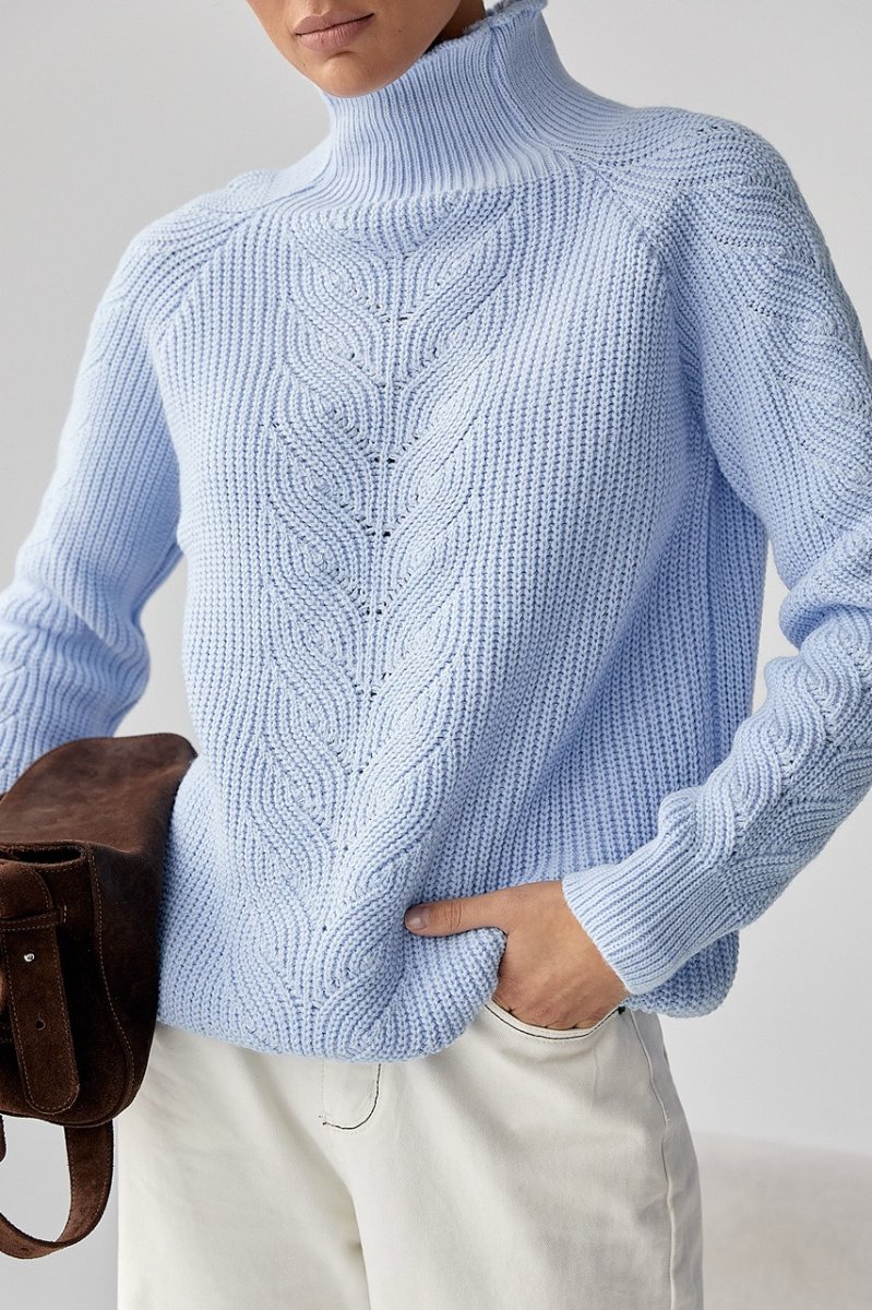 Свитер имеет высокую горловину, которая мягко прилегает к шее и защищает от прохлады, создавая ощущение тепла даже в самые холодные дни. Длинные рукава реглан обеспечивают удобную посадку и свободу движений, а манжеты на рукавах и внизу изделия помогают сохранять форму. Удлиненный фасон придает силуэту изящество и позволяет носить свитер как отдельно, так и в многослойных комплектах.