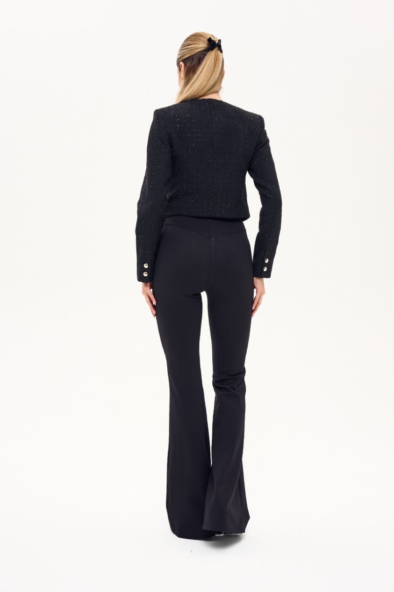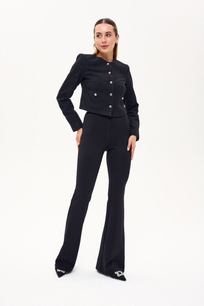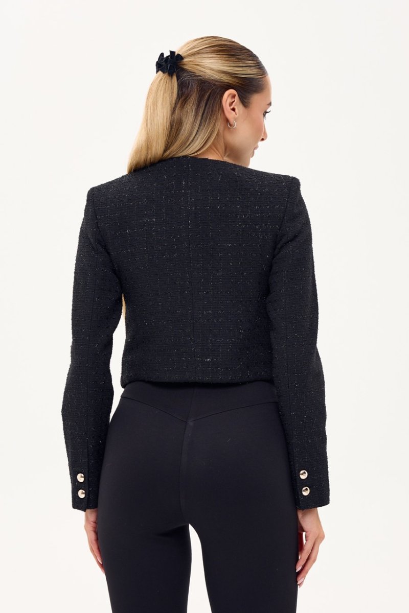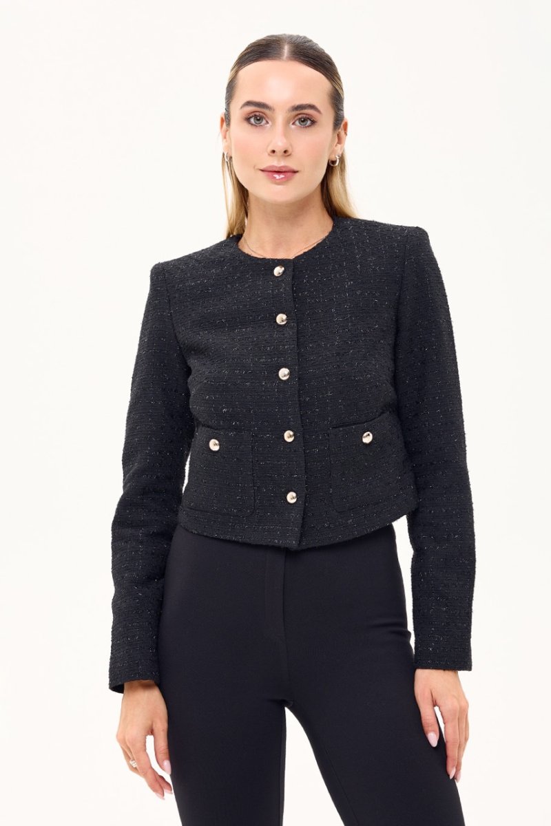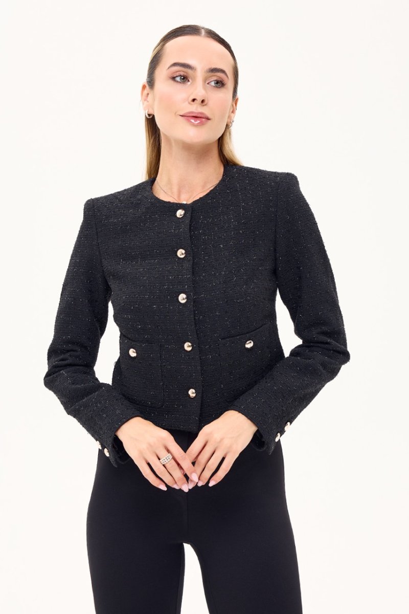 Этот жакет в стиле Шанель сделан из ткани букле с люрексовой нитью. Он имеет маленькие накладные карманы и изысканные золотые пуговицы.