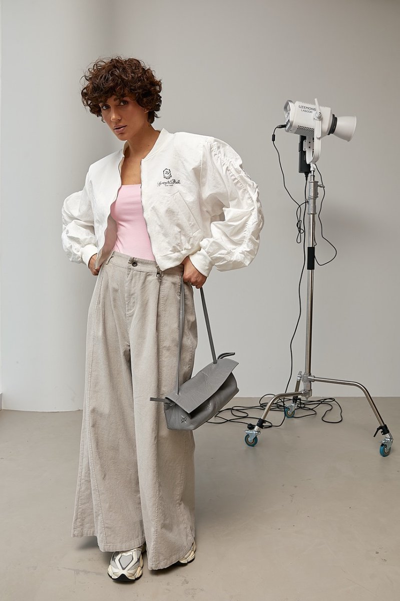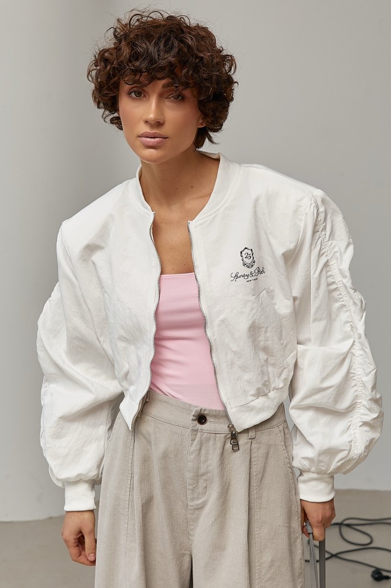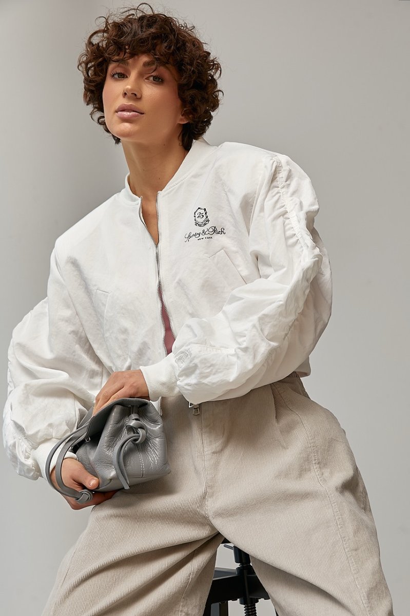 Модель застегивается на молнию, спереди имеет удобные врезные карманы. Объемные рукава с драпировкой придают изделию выразительность и создают эффектный силуэт. Декоративная принт- надпись спереди придает бомберу характер и делает ее ярким элементом образа.